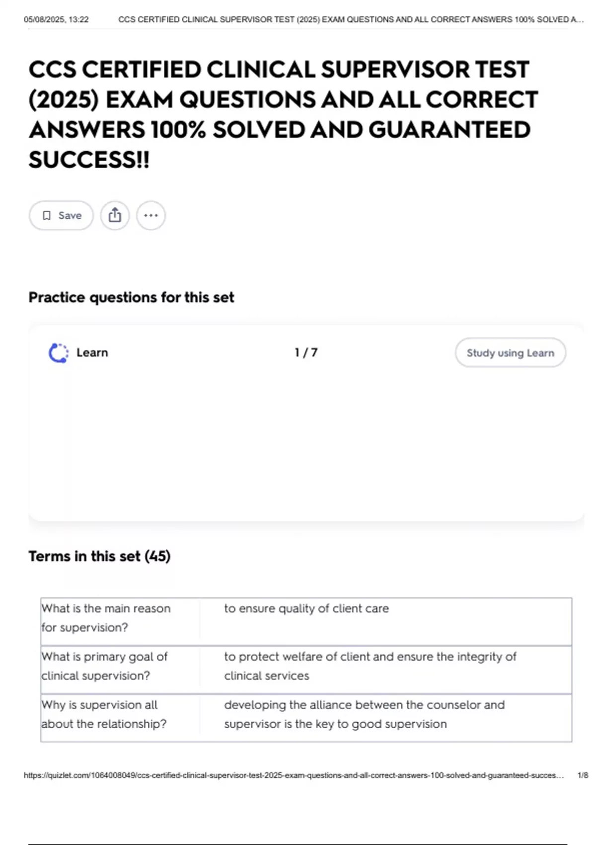 05/08/2025, 13:22 CCS CERTIFIED CLINICAL SUPERVISOR TEST (2025) EXAM QUESTIONS AND ALL CORRECT ANSWERS 100% SOLVED A…