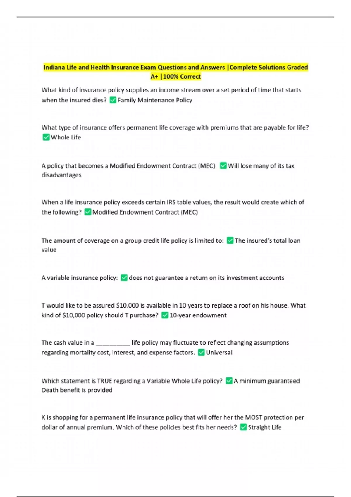 PACKAGE-::Indiana Life Insurance Exams with Correct Answers
