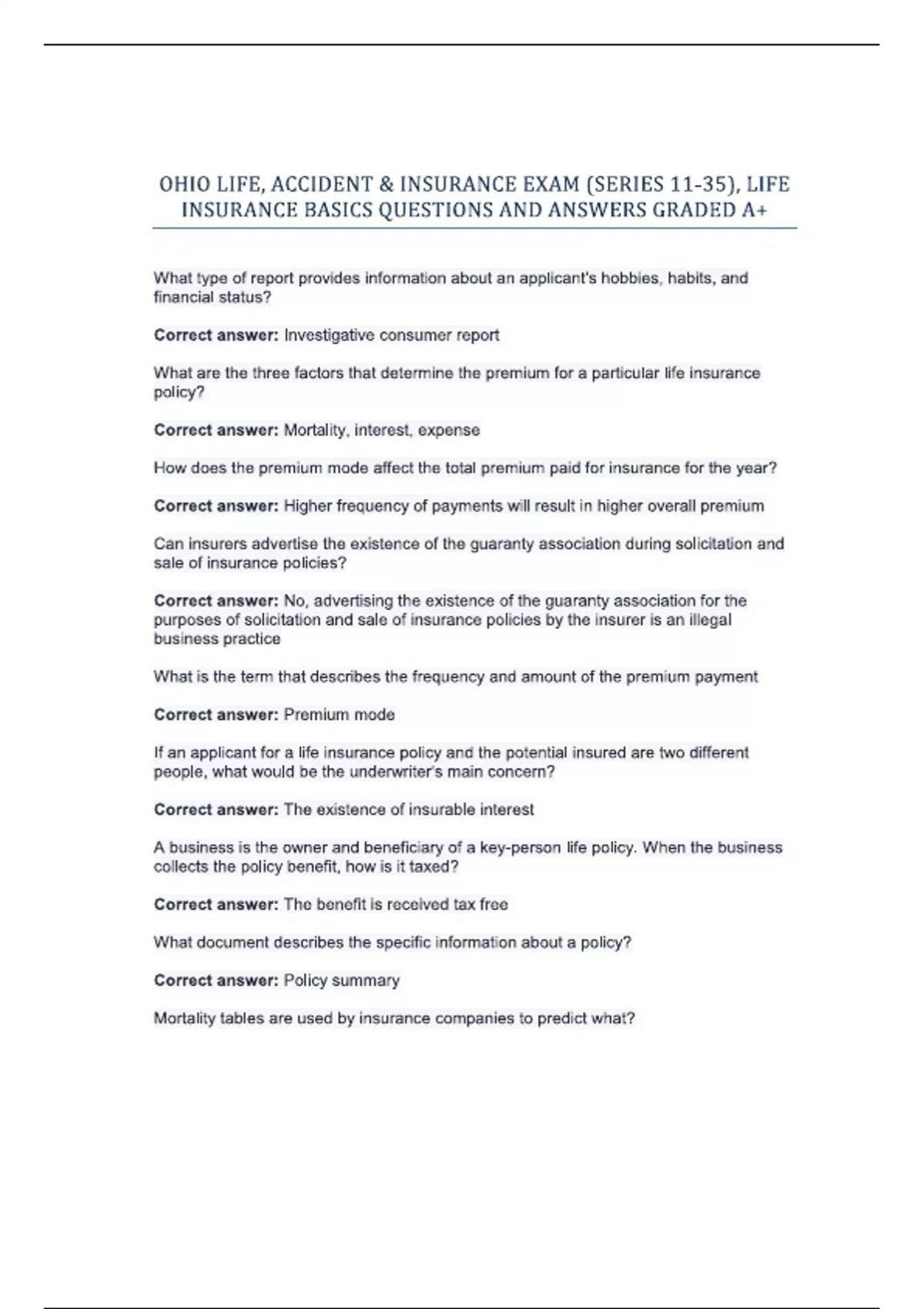 OHIO LIFE, ACCIDENT & INSURANCE EXAM (SERIES 11-35), LIFE INSUARANCE BASICS QUESTIONS AND ANSWERS GRADED A+