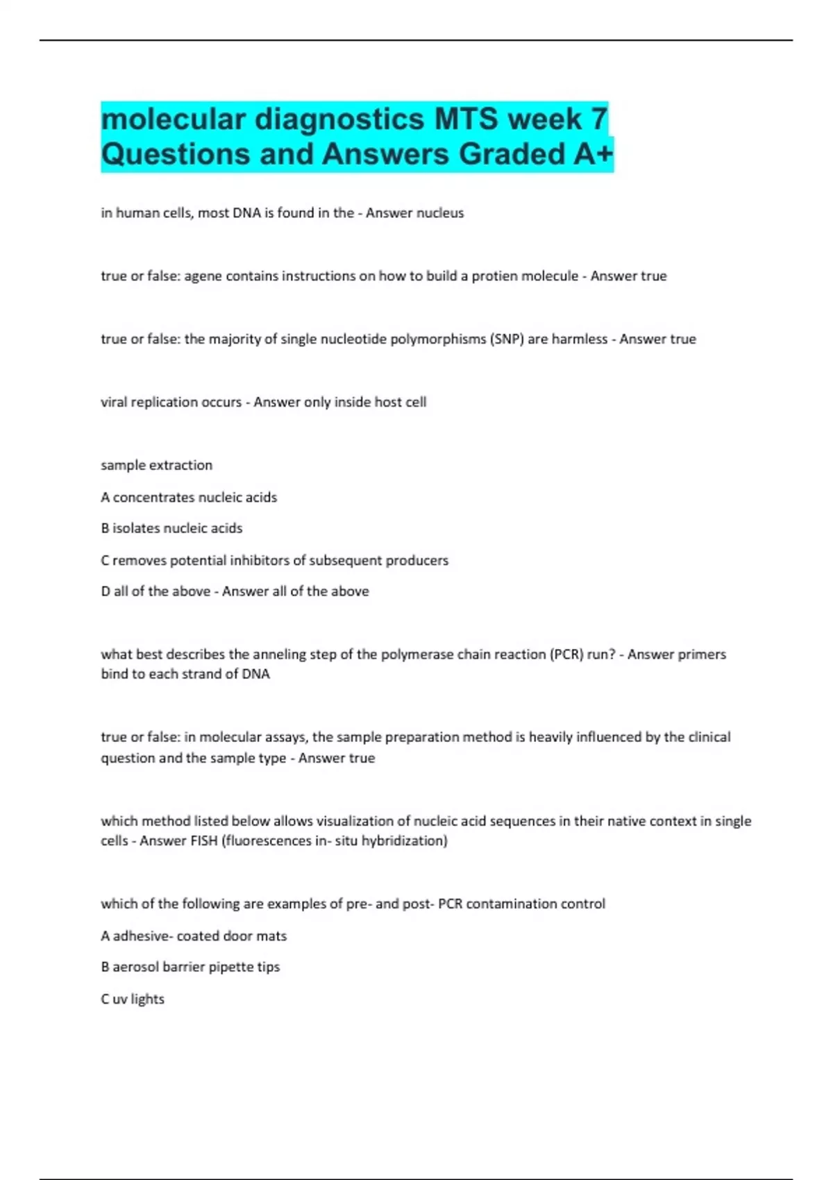 molecular diagnostics MTS week 7 Questions and Answers Graded A+