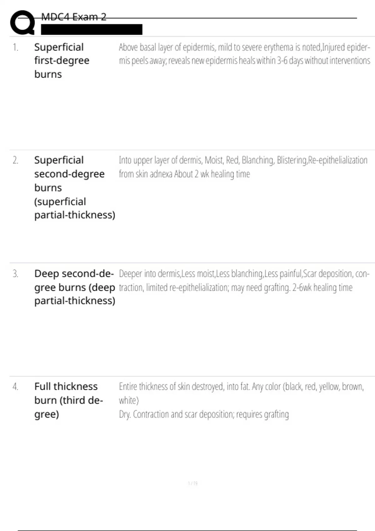 2. Superficial Into upper layer of dermis, Moist, Red, Blanching, Blistering,Re-epithelialization