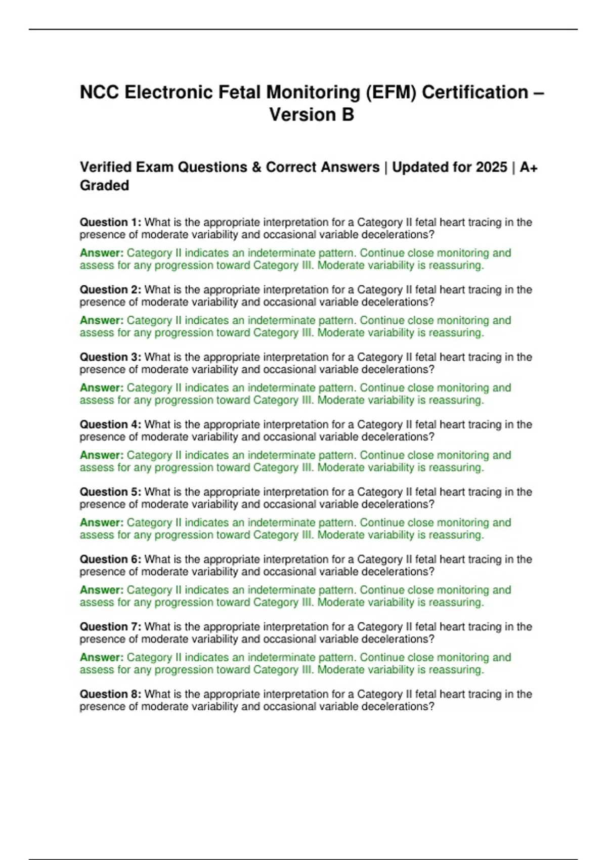 Get fully prepared for the NCC Electronic Fetal Monitoring (EFM) Certification Exam with this comprehensive and updated guide featuring 400 actual exam questions and 100% correct, detailed answers. This professionally verified test bank is designed for nurses, midwives, and healthcare professionals pursuing or renewing their EFM certification. Every question is aligned with the latest NCC EFM exam blueprint and includes thorough explanations to help you master key topics confidently. What You’ll Get: 400 real-style NCC EFM questions Accurate and fully explained answers Covers all exam domains: interpretation, physiology, interventions, documentation & more A+ rated material by top performers Updated for the 2025 certification cycle Ideal for self-study, last-minute prep, or review sessions Pass your EFM exam on the first attempt with this trusted, exam-focused resource.
