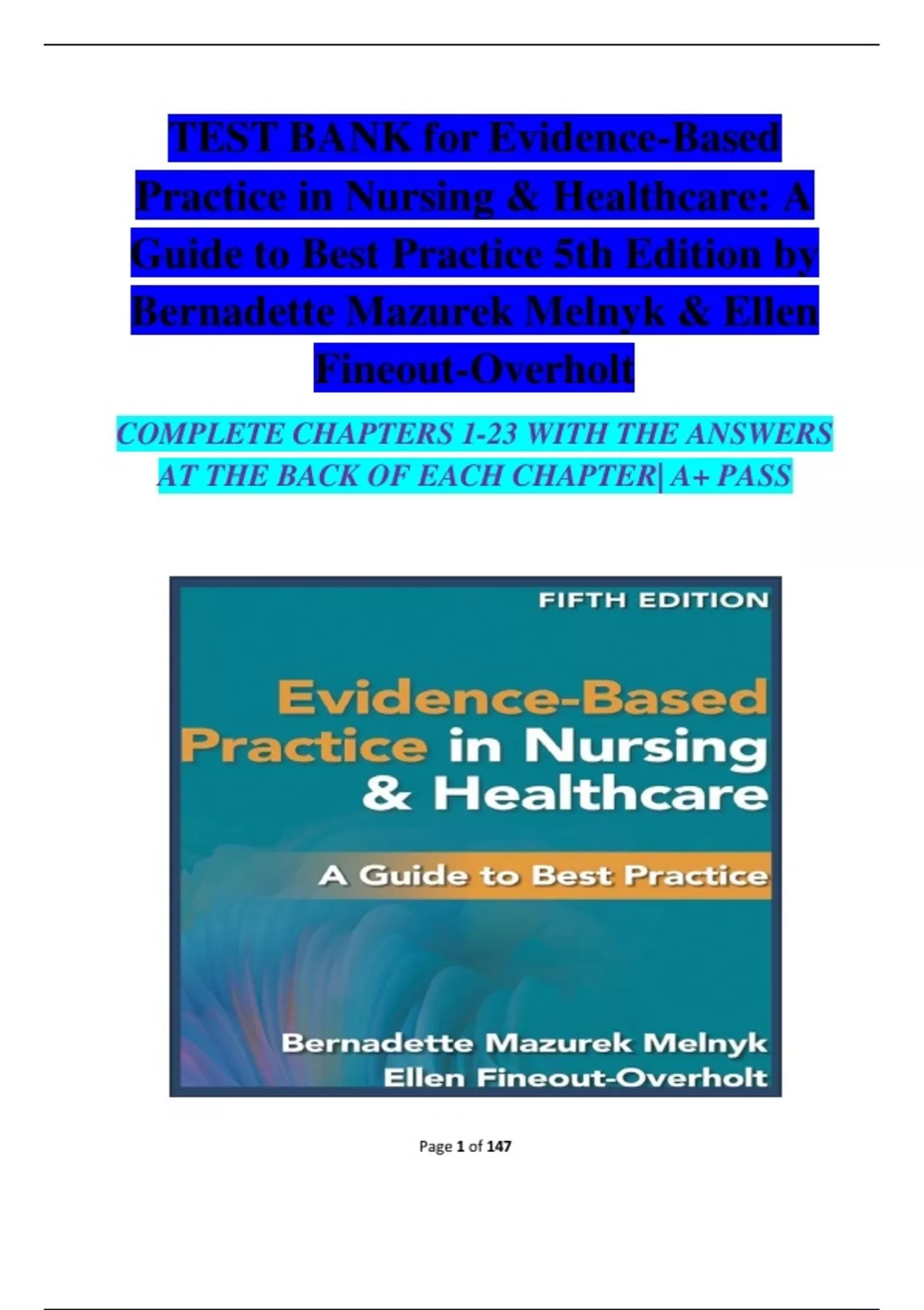 This document provides the full test bank for Evidence-Based Practice in Nursing & Healthcare: A Guide to Best Practice (5th Edition) by Bernadette Mazurek Melnyk and Ellen Fineout-Overholt. It includes multiple-choice and application-based questions with correct answers and detailed rationales, covering all chapters. Topics include formulating clinical questions, searching for and appraising evidence, implementing EBP in practice, and evaluating outcomes. An essential tool for nursing students and professionals mastering EBP principles.