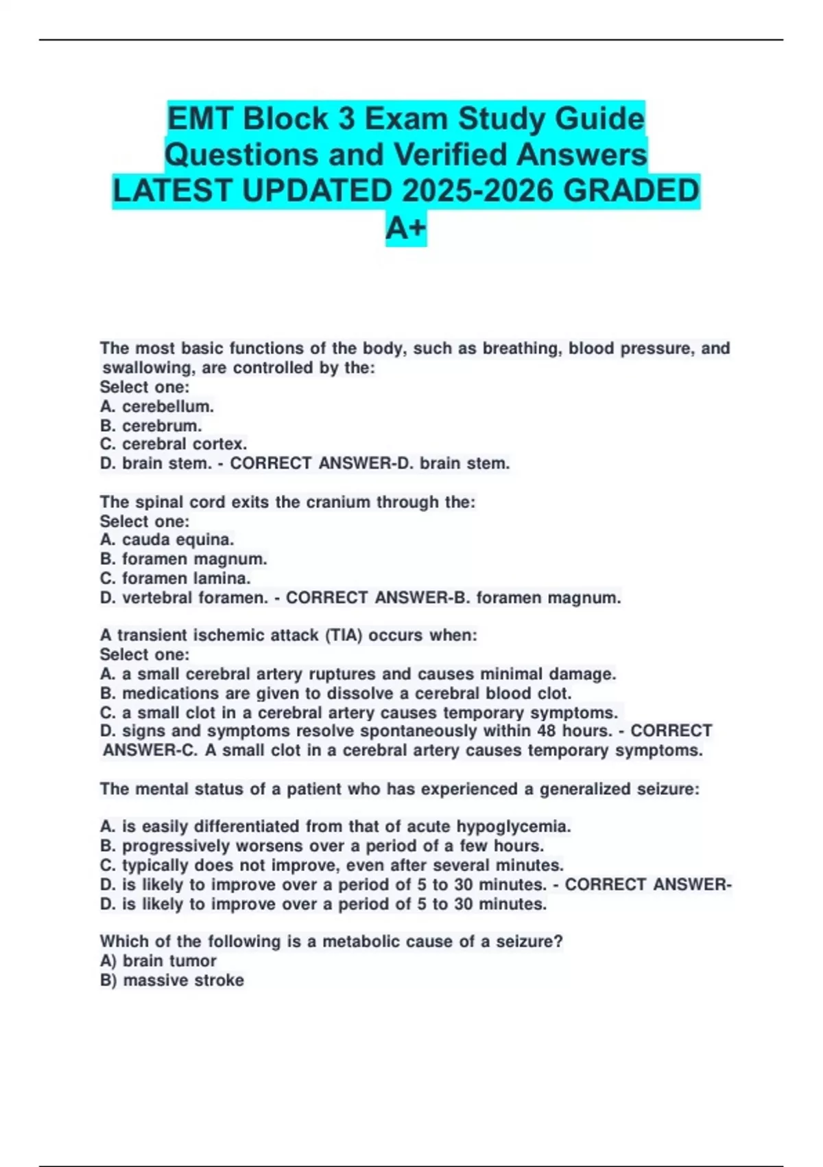 EMT Block 3 Exam Study Guide Questions and Verified Answers LATEST UPDATED GRADED A+ EMT Block 3 Exam Study Guide Questions and Verified Answers LATEST UPDATED GRADED A+EMT Block 3 Exam Study Guide Questions and Verified Answers LATEST UPDATED GRADED A+EMT Block 3 Exam Study Guide Questions and Verified Answers LATEST UPDATED GRADED A+