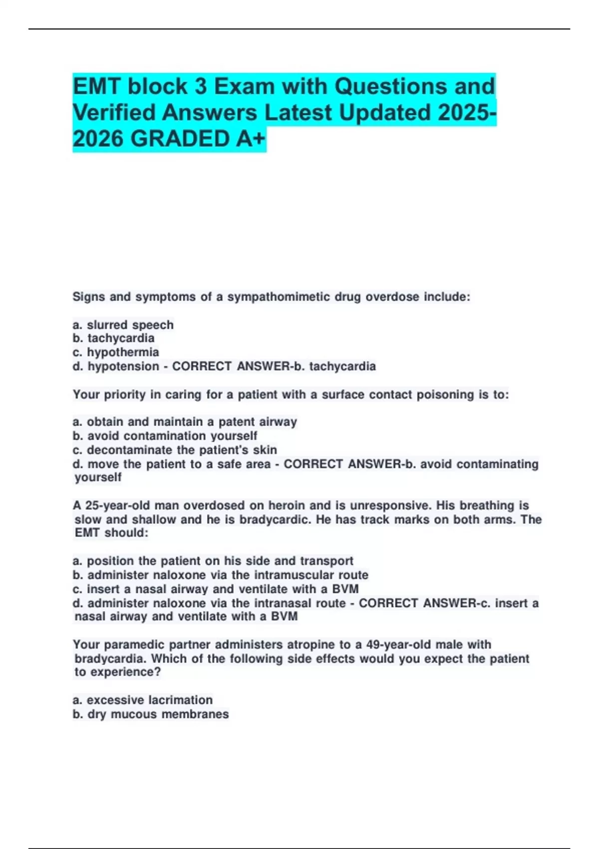 EMT block 3 Exam with Questions and Verified Answers Latest Updated GRADED A+. EMT block 3 Exam with Questions and Verified Answers Latest Updated GRADED A+.EMT block 3 Exam with Questions and Verified Answers Latest Updated GRADED A+.EMT block 3 Exam with Questions and Verified Answers Latest Updated GRADED A+.EMT block 3 Exam with Questions and Verified Answers Latest Updated GRADED A+.