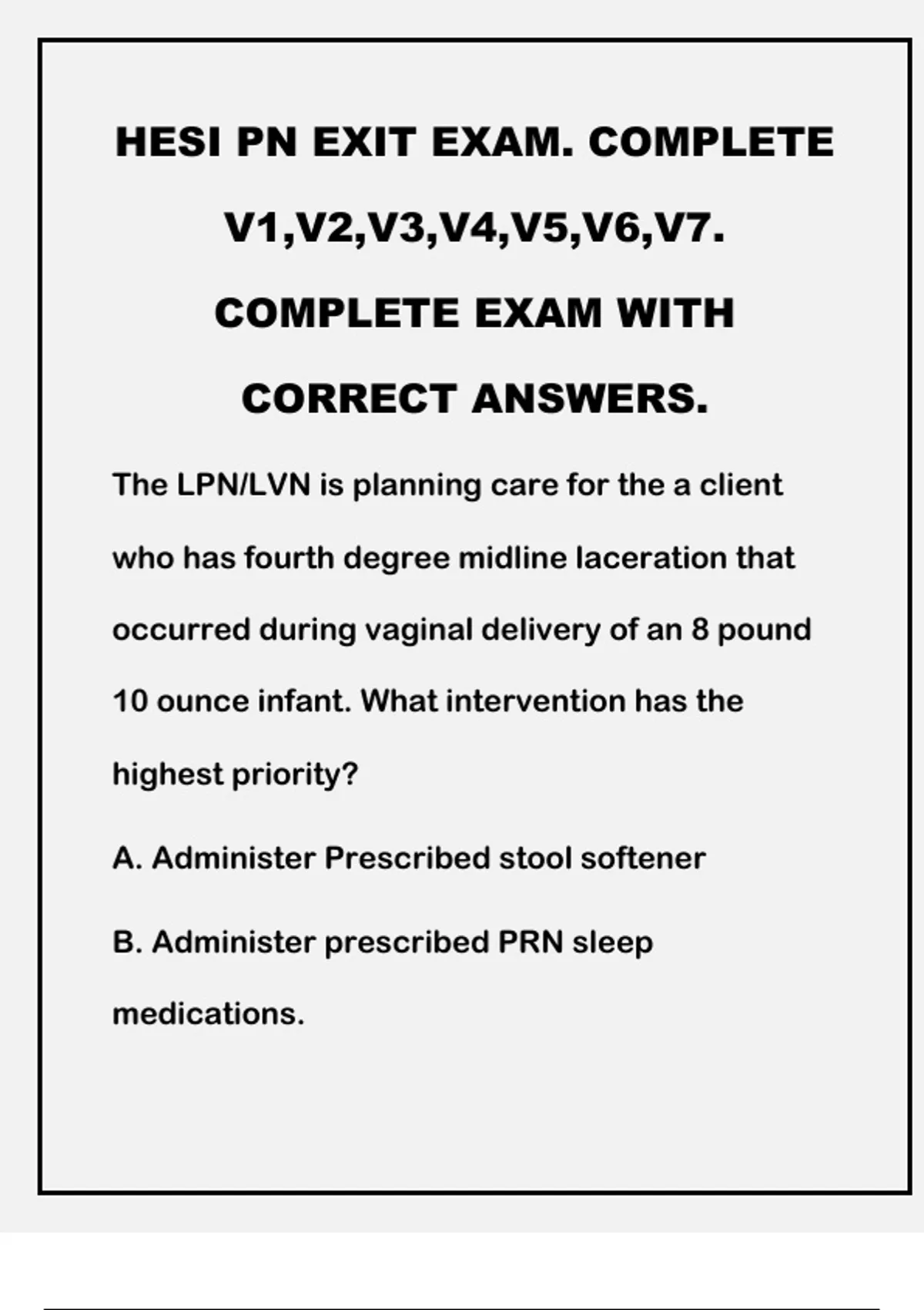 HESI PN EXIT EXAM. COMPLETE V1,V2,V3,V4,V5,V6,V7. COMPLETE EXAM WITH CORRECT ANSWERS.