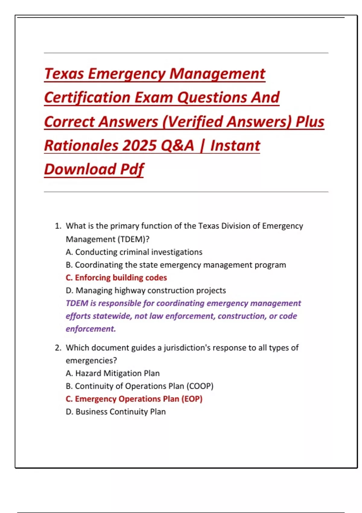 Texas Emergency Management Certification Exam Questions And Correct Answers (Verified Answers) Plus Rationales 2025 Q&A | Instant Download Pdf