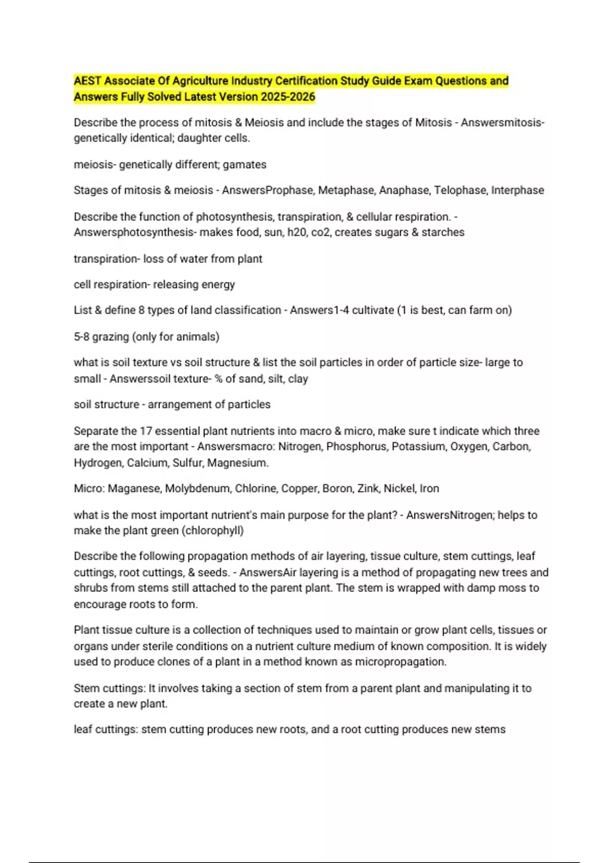 AEST Associate Of Agriculture Industry Certification Study Guide Exam Questions and Answers Fully Solved Latest Version Describe the process of mitosis & Meiosis and include the stages of Mitosis - Answersmitosis- genetically identical; daughter cells. meiosis- genetically different; gamates Stages of mitosis & meiosis - AnswersProphase, Metaphase, Anaphase, Telophase, Interphase Describe the function of photosynthesis, transpiration, & cellular respiration. - Answersphotosynthesis- makes food, sun, h20, co2, creates sugars & starches transpiration- loss of water from plant cell respiration- releasing energy List & define 8 types of land classification - Answers1-4 cultivate (1 is best, can farm on) 5-8 grazing (only for animals) what is soil texture vs soil structure & list the soil particles in order of particle size- large to small - Answerssoil texture- % of sand, silt, clay soil structure - arrangement of particles Separate the 17 essential plant nutrients into macro & micro, make sure t indicate which three are the most important - Answersmacro: Nitrogen, Phosphorus, Potassium, Oxygen, Carbon, Hydrogen, Calcium, Sulfur, Magnesium. Micro: Maganese, Molybdenum, Chlorine, Copper, Boron, Zink, Nickel, Iron what is the most important nutrient's main purpose for the plant? - AnswersNitrogen; helps to make the plant green (chlorophyll) Describe the following propagation methods of air layering, tissue culture, stem cuttings, leaf cuttings, root cuttings, & seeds. - AnswersAir layering is a method of propagating new trees and shrubs from stems still attached to the parent plant. The stem is wrapped with damp moss to encourage roots to form. Plant tissue culture is a collection of techniques used to maintain or grow plant cells, tissues or organs under sterile conditions on a nutrient culture medium of known composition. It is widely used to produce clones of a plant in a method known as micropropagation. Stem cuttings: It involves taking a section of stem from a parent plant and manipulating it to create a new plant. leaf cuttings: stem cutting produces new roots, and a root cutting produces new stems root cuttings: the portion of root is cut from a parent plant (often called a mother plant), placed in a growing medium, and then left to grow its own system of roots and stems. seeds: is the method of plant propagation (multiplying, reproducing, or breeding new plants) that is done through the use of seeds. What is germination vs propagation - Answersgermination- seed sprouts propagation- growing plants Describe asexual plant propagation & sexual plant propagation. - Answersasexual: cuttings, layering, division, buddings, & grafting sexual:involves the union of the pollen (male) with the egg (female) to produce a seed Breakdown the spermatophyta category of plants & describe each sub level. - AnswersGymnosperm- cones, naked seeds