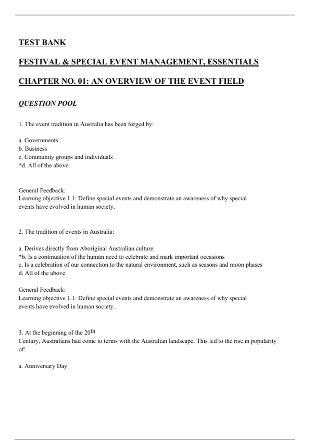 This document offers the complete test bank for Festival & Special Event Management, Essentials Edition (1st Edition) by Johnny Allen, Robert Harris, and Leo Jago (ISBN 9780730369400). It includes multiple-choice and true/false questions with answers for all chapters, covering core concepts such as event planning, risk management, marketing, sponsorship, logistics, and evaluation. Perfect for instructors preparing assessments or students studying for exams in event and tourism management courses.