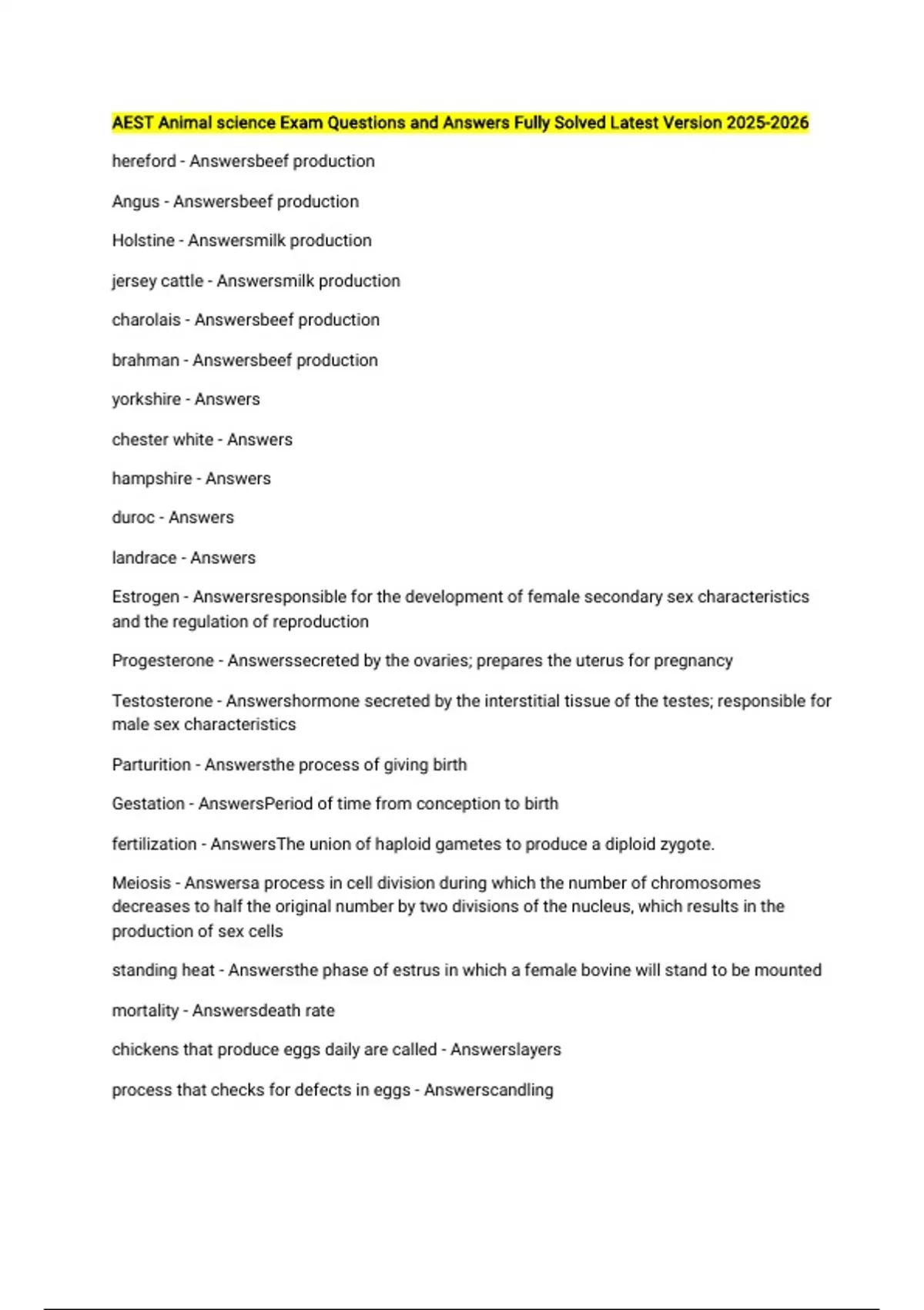 AEST Animal science Exam Questions and Answers Fully Solved Latest Version hereford - Answersbeef production Angus - Answersbeef production Holstine - Answersmilk production jersey cattle - Answersmilk production charolais - Answersbeef production brahman - Answersbeef production yorkshire - Answers chester white - Answers hampshire - Answers duroc - Answers landrace - Answers Estrogen - Answersresponsible for the development of female secondary sex characteristics and the regulation of reproduction Progesterone - Answerssecreted by the ovaries; prepares the uterus for pregnancy Testosterone - Answershormone secreted by the interstitial tissue of the testes; responsible for male sex characteristics Parturition - Answersthe process of giving birth Gestation - AnswersPeriod of time from conception to birth fertilization - AnswersThe union of haploid gametes to produce a diploid zygote. Meiosis - Answersa process in cell division during which the number of chromosomes decreases to half the original number by two divisions of the nucleus, which results in the production of sex cells standing heat - Answersthe phase of estrus in which a female bovine will stand to be mounted mortality - Answersdeath rate