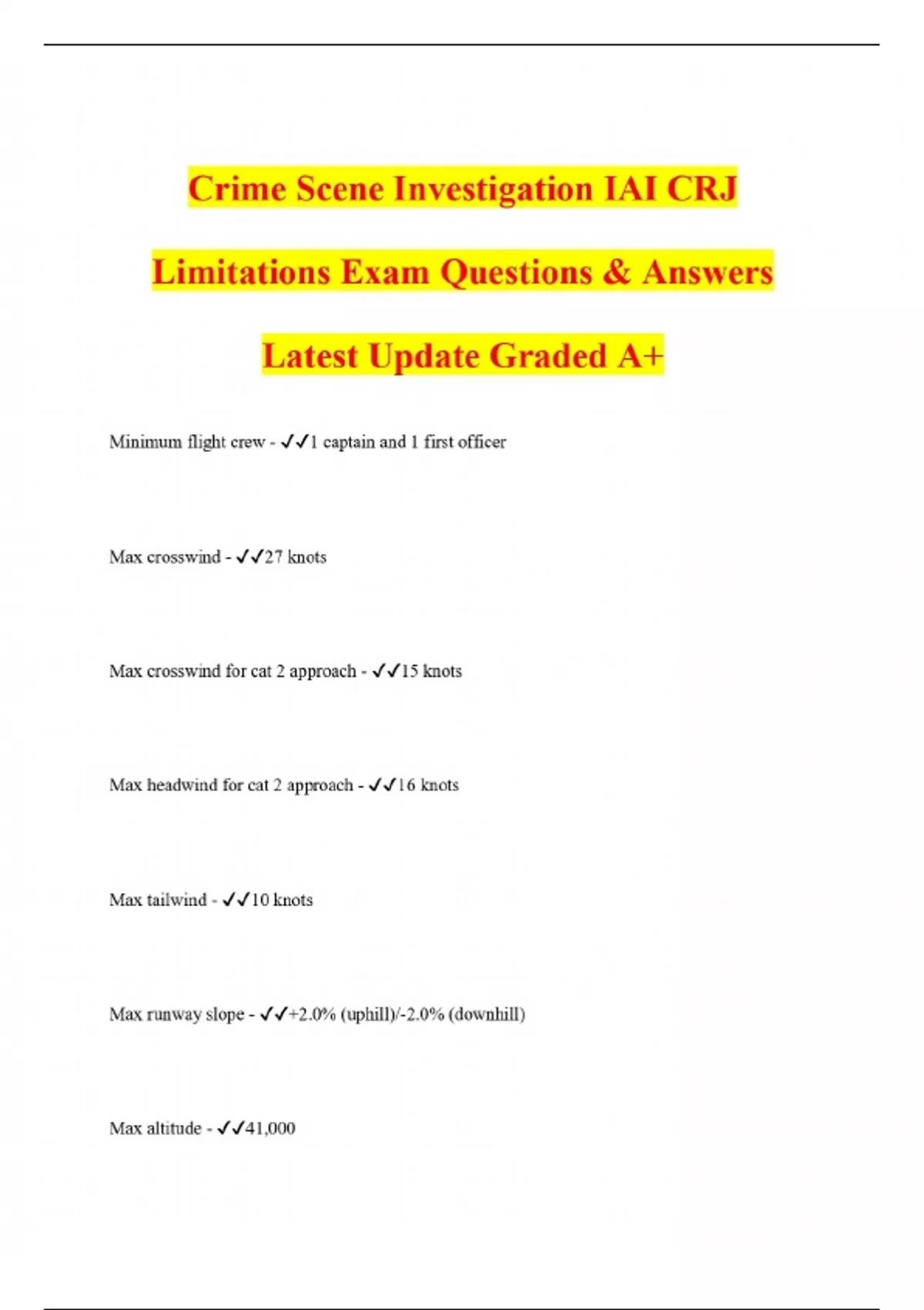 Crime Scene Investigation IAI CRJ Limitations Exam Questions & Answers Latest Update Graded A+ Minimum flight crew - 1 captain and 1 first officer