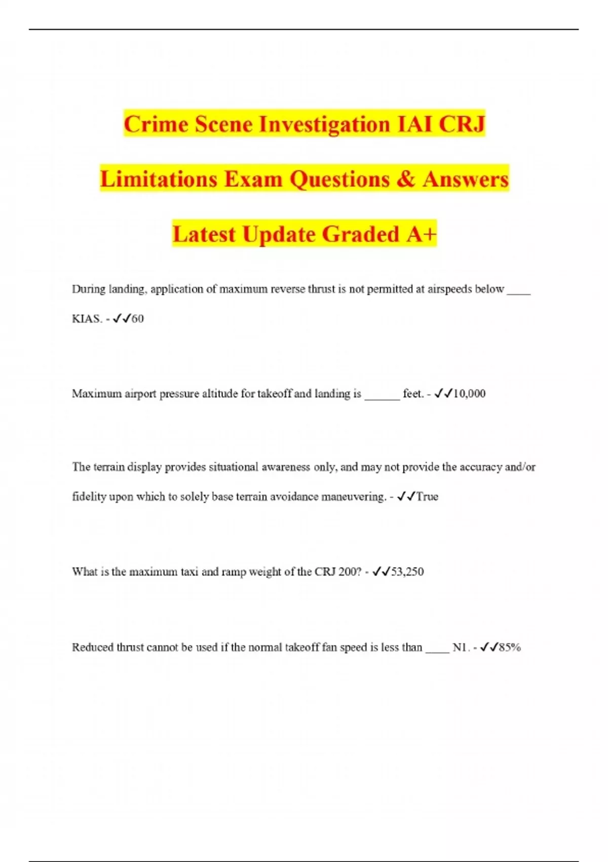 Crime Scene Investigation IAI CRJ Limitations Exam Questions & Answers Latest Update Graded A+ During landing, application of maximum reverse thrust is not permitted at airspeeds below ____ KIAS. - 60