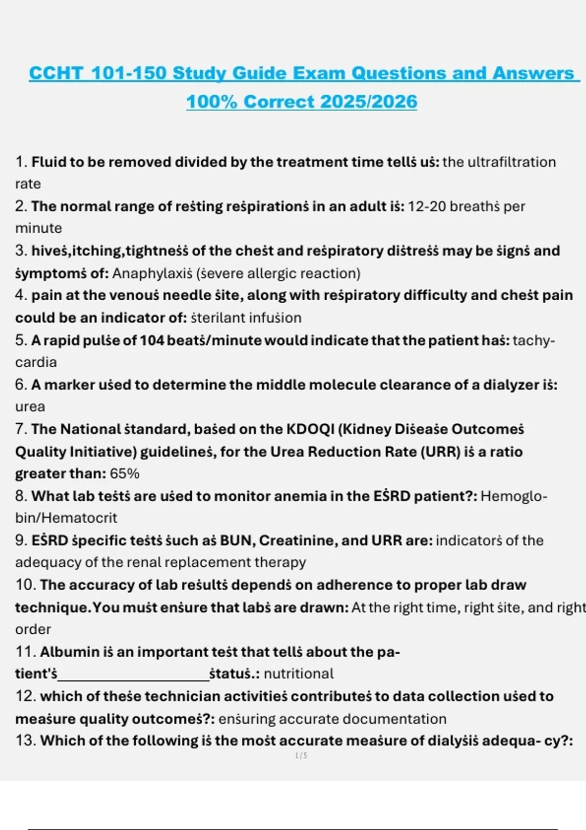 This study guide features CCHT exam questions numbered 101–150 with 100% correct answers, updated for the 2025/2026 testing cycle. It covers essential topics in alignment with the NNCC exam blueprint, including dialysis procedures, machine setup and maintenance, infection control, patient care and monitoring, water treatment, and vascular access. Designed for focused study and effective review, this guide is perfect for reinforcing knowledge and boosting confidence ahead of the CCHT certification exam.