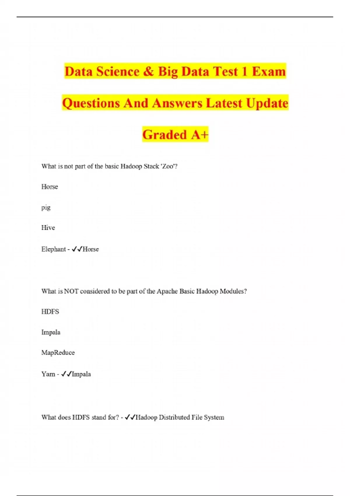 Data Science & Big Data Test 1 Exam Questions And Answers Latest Update Graded A+