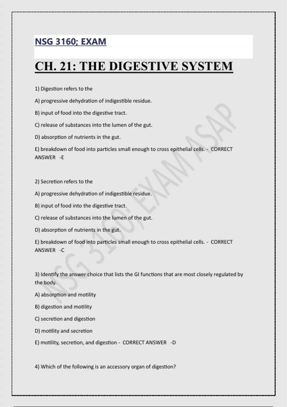 NSG 3160; EXAM CH. 21: THE DIGESTIVE SYSTEM 1) Digestion refers to the A) progressive dehydration of indigestible residue. B) input of food into the digestive tract. C) release of substances into the lumen of the gut. D) absorption of nutrients in the gut. E) breakdown of food into particles small enough to cross epithelial cells. - CORRECT ANSWER -E 2) Secretion refers to the A) progressive dehydration of indigestible residue. B) input of food into the digestive tract. C) release of substances into the lumen of the gut. D) absorption of nutrients in the gut. E) breakdown of food into particles small enough to cross epithelial cells. - CORRECT ANSWER -C 3) Identify the answer choice that lists the GI functions that are most closely regulated by the body. A) absorption and motility B) digestion and motility C) secretion and digestion D) motility and secretion E) motility, secretion, and digestion - CORRECT ANSWER -D 4) Which of the following is an accessory organ of digestion?