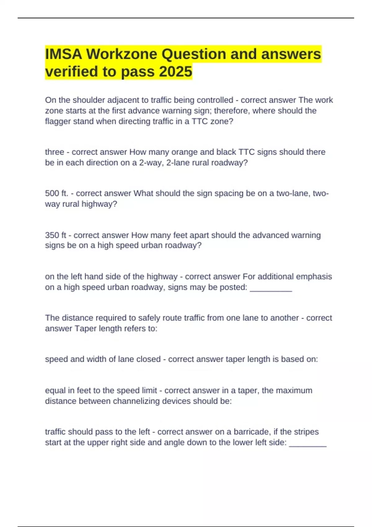 IMSA Workzone Question and answers verified to pass 2025 On the shoulder adjacent to traffic being controlled - correct answer The work zone starts at the first advance warning sign; therefore, where should the flagger stand when directing traffic in a TTC zone? three - correct answer How many orange and black TTC signs should there be in each direction on a 2-way, 2-lane rural roadway? 500 ft. - correct answer What should the sign spacing be on a two-lane, two-way rural highway? 350 ft - correct answer How many feet apart should the advanced warning signs be on a high speed urban roadway? on the left hand side of the highway - correct answer For additional emphasis on a high speed urban roadway, signs may be posted: _________ The distance required to safely route traffic from one lane to another - correct answer Taper length refers to: speed and width of lane closed - correct answer taper length is based on: equal in feet to the speed limit - correct answer in a taper, the maximum distance between