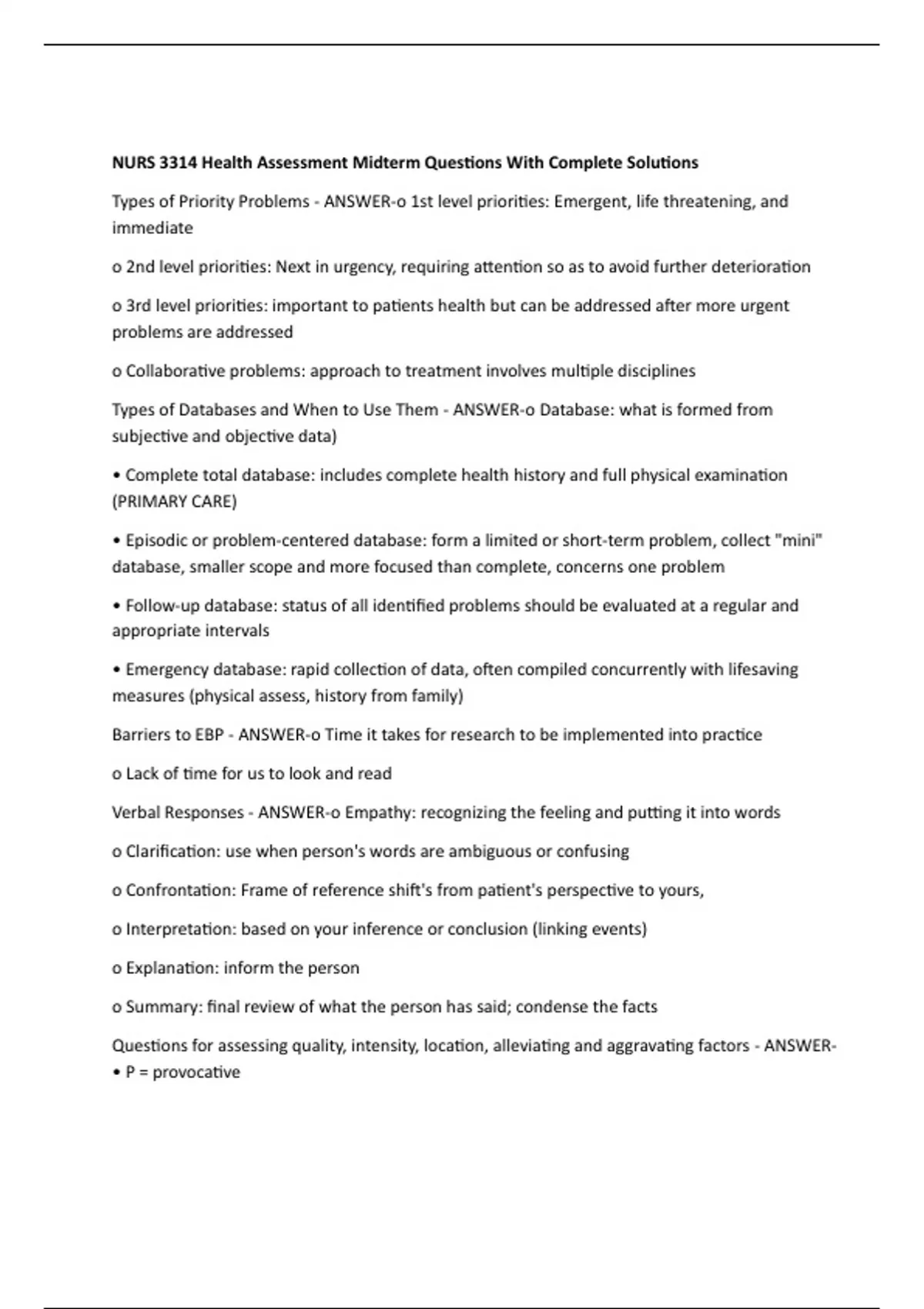 NURS 3314 Health Assessment Midterm Questions With Complete Solutions