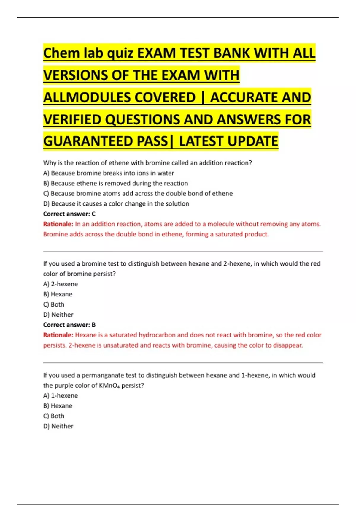 Chem lab quiz EXAM TEST BANK WITH ALL VERSIONS OF THE EXAM WITH ALLMODULES COVERED | ACCURATE AND VERIFIED QUESTIONS AND ANSWERS FOR GUARANTEED PASS| LATEST UPDATE