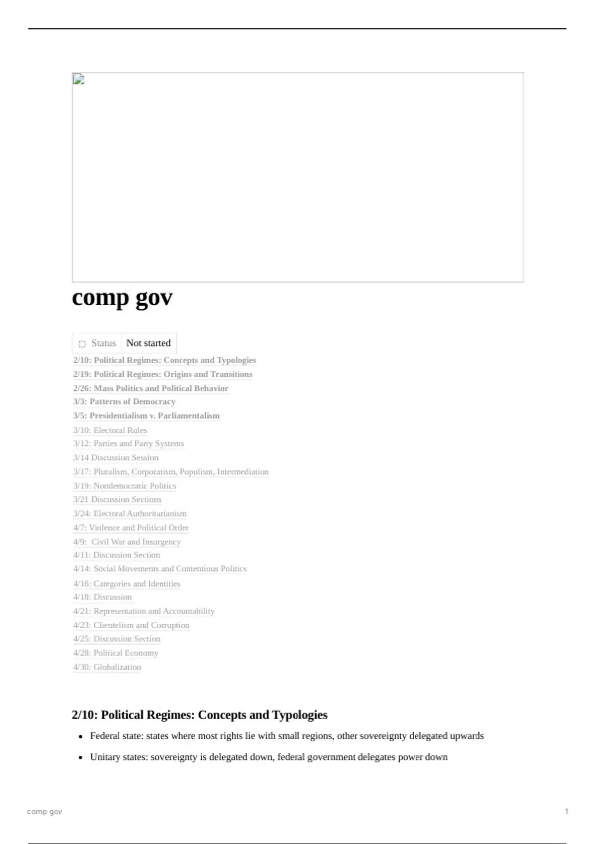 These are my lecture notes for Intro to Comparative Government, also known as GOVT 1313 for Spring 2025. I got an A in the class and on the final. They also include section notes that discuss the readings for the week. I joined the class late, so some of the first couple of lectures are not included. Everything else is included.