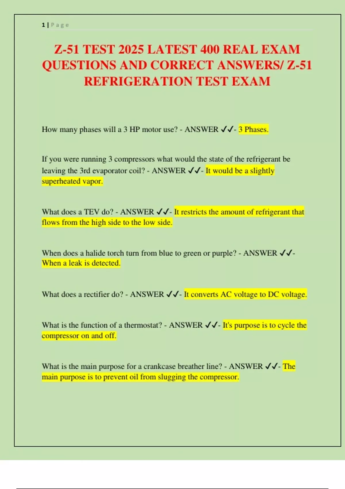 Z-51 TEST 2025 LATEST 400 REAL EXAM QUESTIONS AND CORRECT ANSWERS/ Z-51 REFRIGERATION TEST EXAM This document includes a wide range of practice questions and answers specifically for the FDNY Z-51 Refrigeration Engineer License exam. It covers essential exam topics such as compressor mechanics, refrigerant properties, condenser and evaporator operations, steam systems, electrical components, and NYC Fire Code regulations. Each question is paired with accurate, detailed explanations to aid in understanding and retention. Ideal for final exam prep or review.