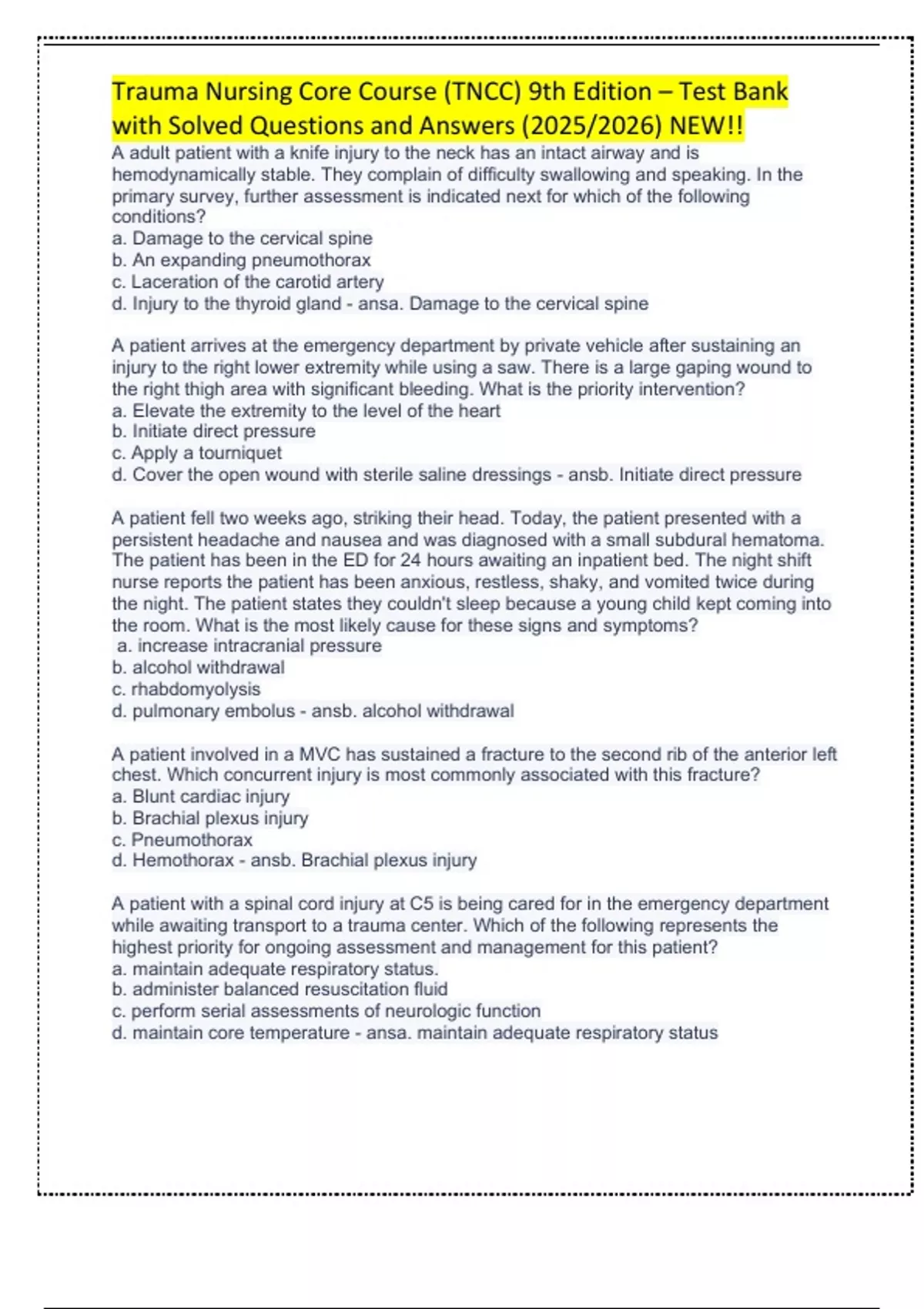 , Trauma Nursing Core Course (TNCC) 9th Edition – Test Bank