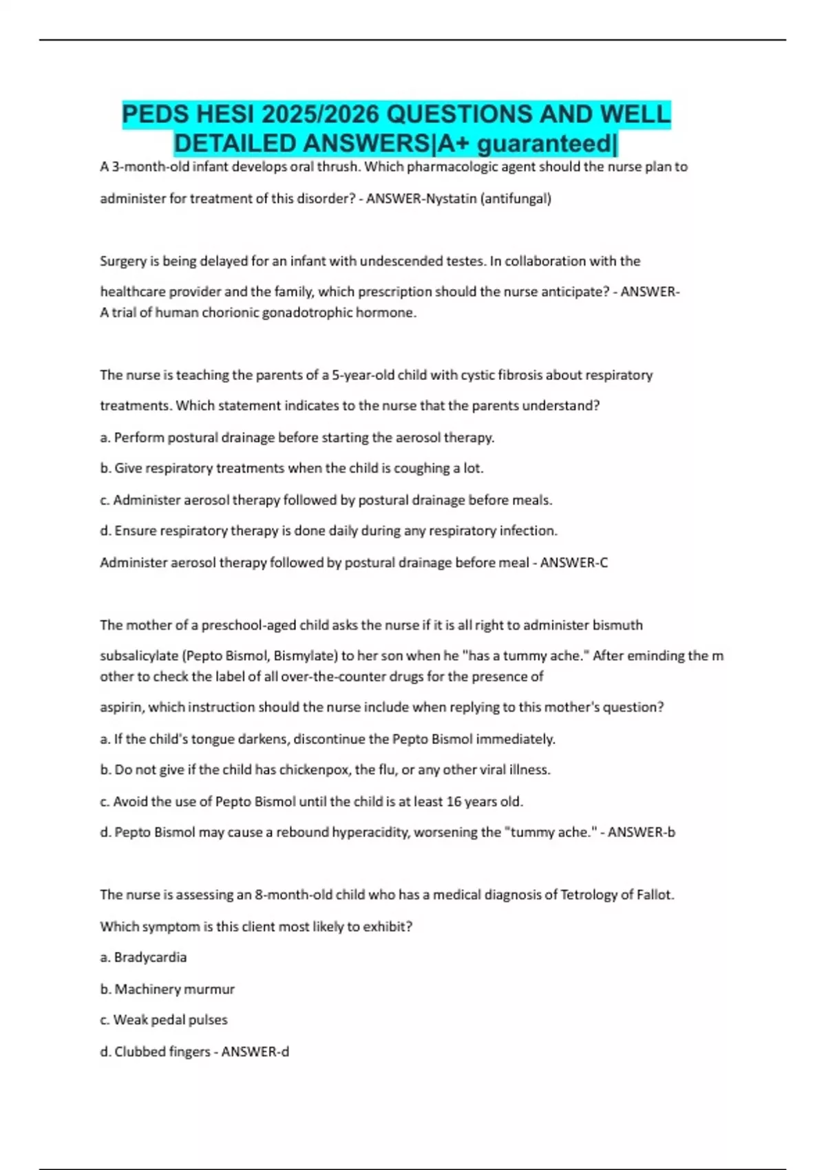PEDS HESI 2025/2026 QUESTIONS AND WELL