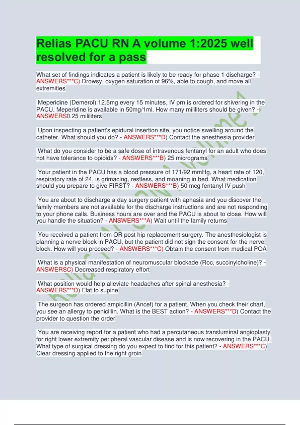Relias PACU RN A volume 1:2025 well resolved for a pass