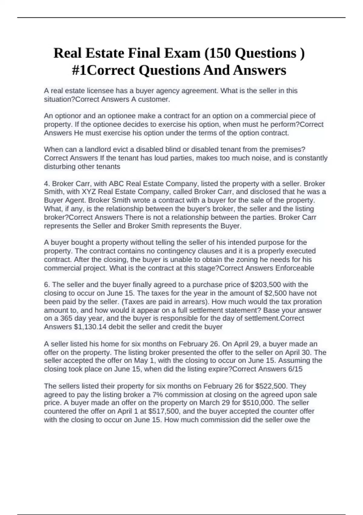 Real Estate Final Exam (150 Questions ) #1Correct Questions And Answers
