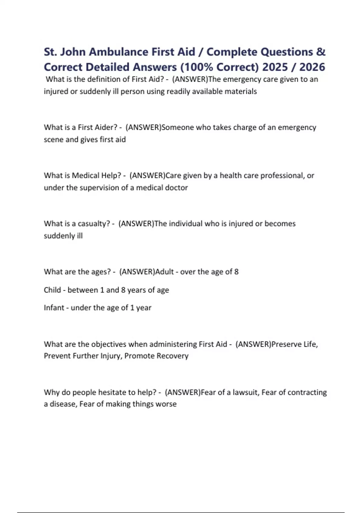 St. John Ambulance First Aid / Complete Questions & Correct Detailed Answers (100% Correct) 2025 / 2026