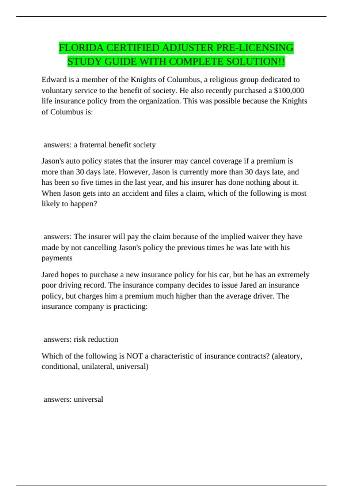 FLORIDA CERTIFIED ADJUSTER PRE-LICENSING STUDY GUIDE WITH COMPLETE SOLUTION!!