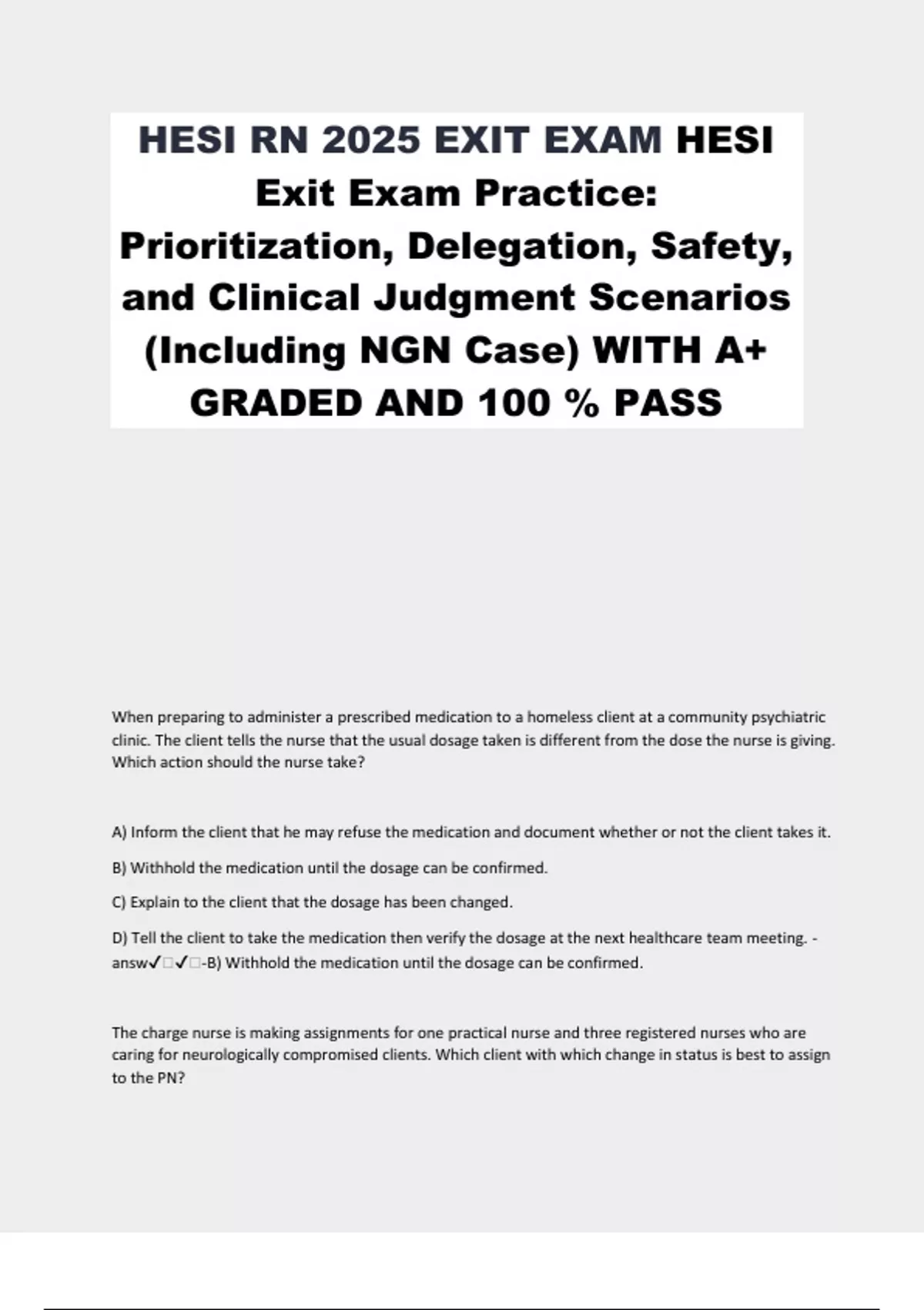 HESI RN 2025 EXIT EXAM HESI Exit Exam Practice: Prioritization, Delegation, Safety, and Clinical Judgment Scenarios (Including NGN Case) WITH A+ GRADED AND 100 % PASS