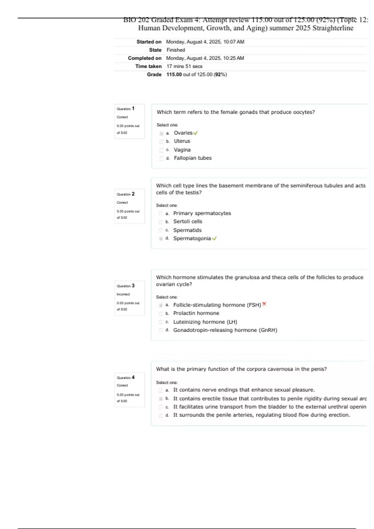 BIO 202 Graded Exam 4: Attempt review 115.00 out of 125.00 (92%) (Topic 12: Human Development, Growth, and Aging) summer 2025 Straighterline