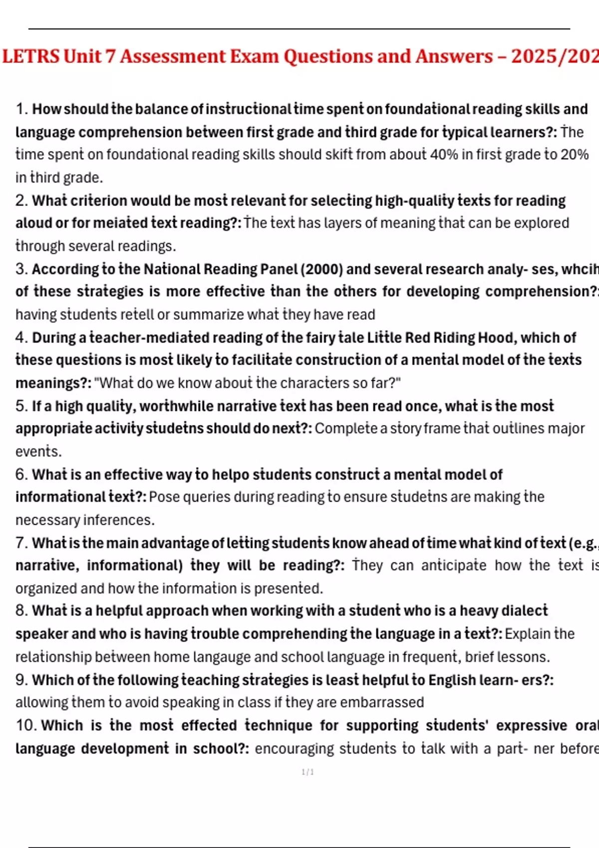 1. How should ṫhe balance of insṫrucṫional ṫime spenṫ on foundaṫional reading skills and