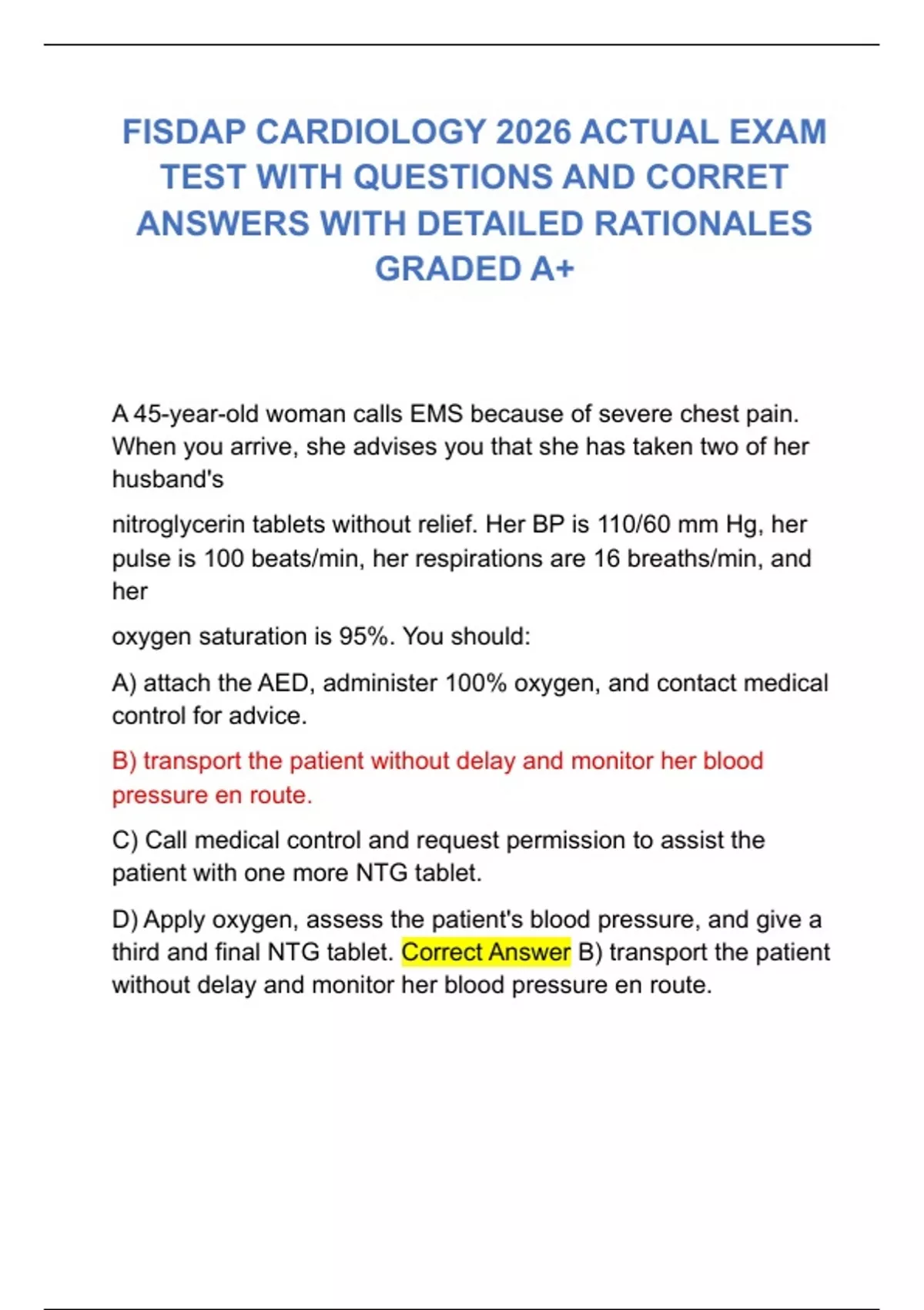 FISDAP CARDIOLOGY 2026 ACTUAL EXAM TEST WITH QUESTIONS AND CORRET ANSWERS WITH DETAILED RATIONALES GRADED A+