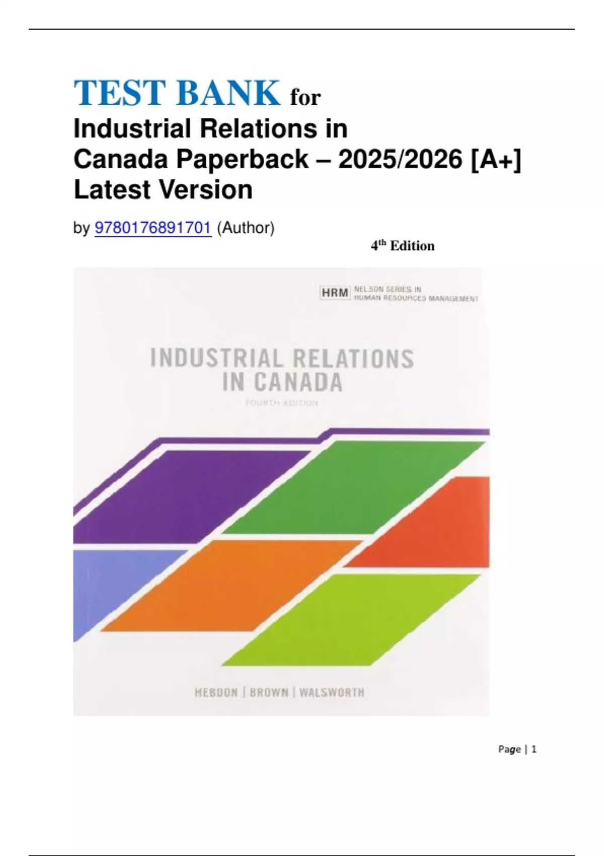 TEST BANK for Industrial Relations in Canada Paperback – 2025/2026 [A+] Latest Version by 9780176891701 (Author)
