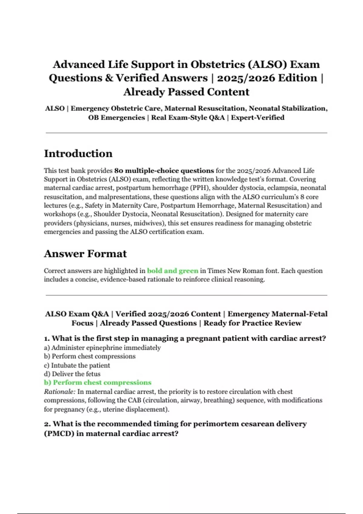 This document features a comprehensive set of exam-style questions and verified answers for the Advanced Life Support in Obstetrics (ALSO) certification. Topics include emergency obstetric care, maternal resuscitation, neonatal stabilization, and the management of common OB emergencies. Designed to reflect the real exam format, this resource is based on already passed content and verified by experts for accuracy and relevance to the 2025/2026 guidelines.