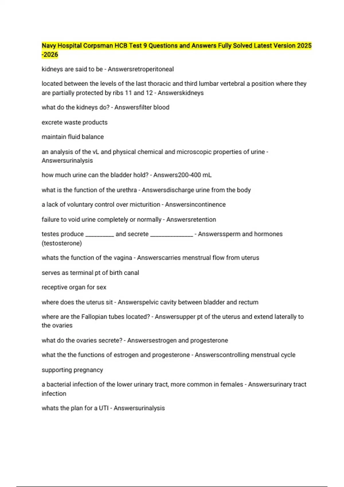 Navy Hospital Corpsman HCB Test 9 Questions and Answers Fully Solved Latest Version kidneys are said to be - Answersretroperitoneal located between the levels of the last thoracic and third lumbar vertebral a position where they are partially protected by ribs 11 and 12 - Answerskidneys what do the kidneys do? - Answersfilter blood excrete waste products maintain fluid balance an analysis of the vL and physical chemical and microscopic properties of urine - Answersurinalysis how much urine can the bladder hold? - Answers200-400 mL what is the function of the urethra - Answersdischarge urine from the body a lack of voluntary control over micturition - Answersincontinence failure to void urine completely or normally - Answersretention testes produce __________ and secrete _______________ - Answerssperm and hormones (testosterone) whats the function of the vagina - Answerscarries menstrual flow from uterus serves as terminal pt of birth canal receptive organ for sex where does the uterus sit - Answerspelvic cavity between bladder and rectum where are the Fallopian tubes located? - Answersupper pt of the uterus and extend laterally to the ovaries what do the ovaries secrete? - Answersestrogen and progesterone what the the functions of estrogen and progesterone - Answerscontrolling menstrual cycle supporting pregnancy a bacterial infection of the lower urinary tract, more common in females - Answersurinary tract infection whats the plan for a UTI - Answersurinalysis admin antibiotics pt edu. about hydration and hygiene an acute infection of the kidneys (upper urinary tract infection) - Answerspyelonephritis what can you do to test for pyelonephritis - Answerscostovertebral angle tenderness whats the plan for pyelonephritis - Answersurinalysis admin antibiotics admin IV fluids
