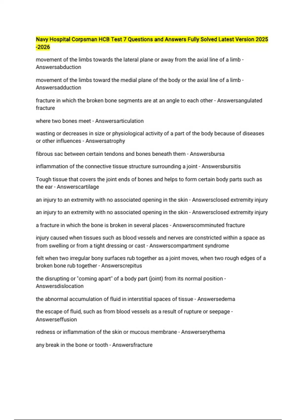 Navy Hospital Corpsman HCB Test 7 Questions and Answers Fully Solved Latest Version movement of the limbs towards the lateral plane or away from the axial line of a limb - Answersabduction movement of the limbs toward the medial plane of the body or the axial line of a limb - Answersadduction fracture in which the broken bone segments are at an angle to each other - Answersangulated fracture where two bones meet - Answersarticulation wasting or decreases in size or physiological activity of a part of the body because of diseases or other influences - Answersatrophy fibrous sac between certain tendons and bones beneath them - Answersbursa inflammation of the connective tissue structure surrounding a joint - Answersbursitis Tough tissue that covers the joint ends of bones and helps to form certain body parts such as the ear - Answerscartilage an injury to an extremity with no associated opening in the skin - Answersclosed extremity injury an injury to an extremity with no associated opening in the skin - Answersclosed extremity injury a fracture in which the bone is broken in several places - Answerscomminuted fracture injury caused when tissues such as blood vessels and nerves are constricted within a space as from swelling or from a tight dressing or cast - Answerscompartment syndrome felt when two irregular bony surfaces rub together as a joint moves, when two rough edges of a broken bone rub together - Answerscrepitus the disrupting or "coming apart" of a body part (joint) from its normal position - Answersdislocation the abnormal accumulation of fluid in interstitial spaces of tissue - Answersedema the escape of fluid, such as from blood vessels as a result of rupture or seepage - Answerseffusion redness or inflammation of the skin or mucous membrane - Answerserythema any break in the bone or tooth - Answersfracture an incomplete fracture - Answersgreenstick fracture a manner of walking or moving on foot - Answersgait a form of arthritis, is a disorder or purine metabolism that results from an elevated serum uric acid level - Answersgout is what causes the injury - Answersmechanism of injury branch of medicine concerned with the prevention or correction of disorders of the musculoskeletal system - Answersorthopedics