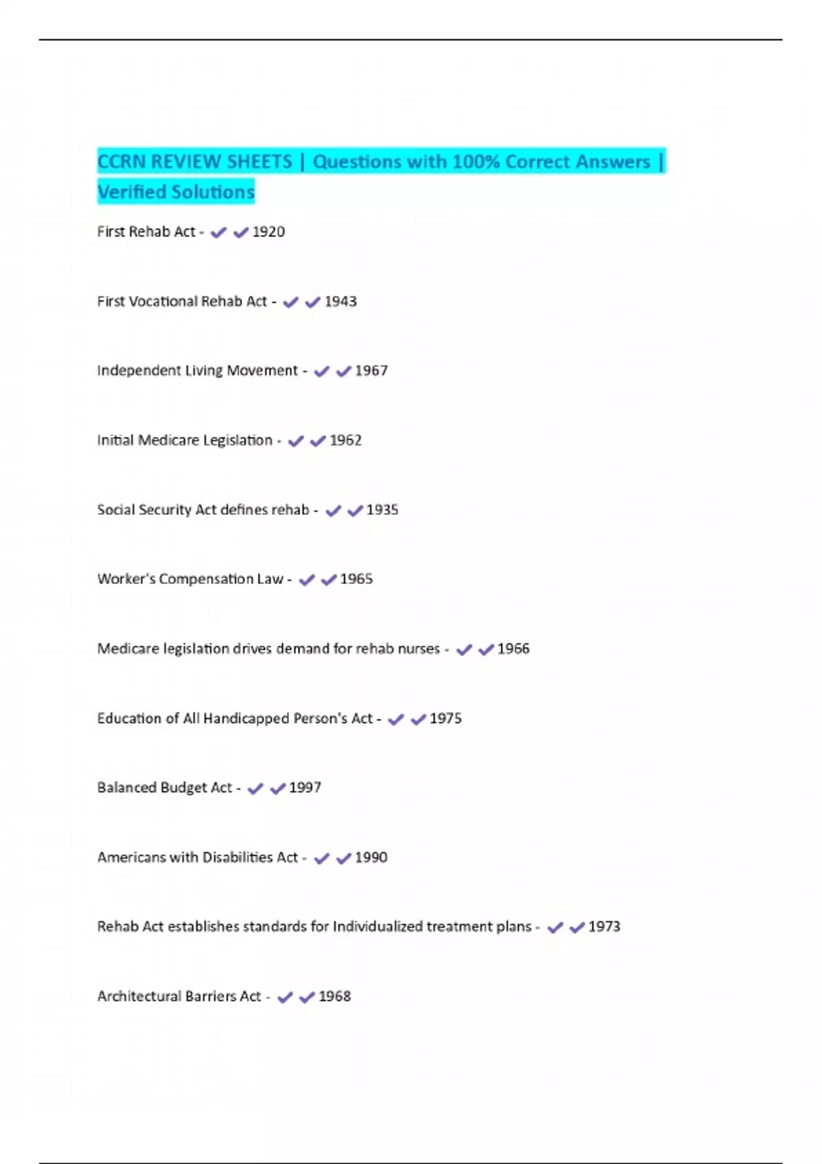 CCRN REVIEW SHEETS | Questions with 100% Correct Answers | Verified Solutions