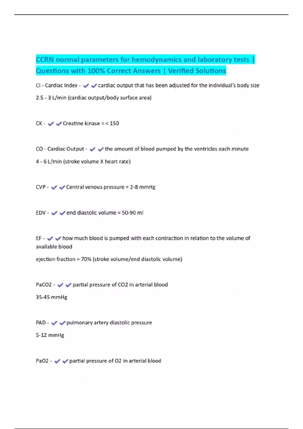 CCRN normal parameters for hemodynamics and laboratory tests | Questions with 100% Correct Answers | Verified Solutions