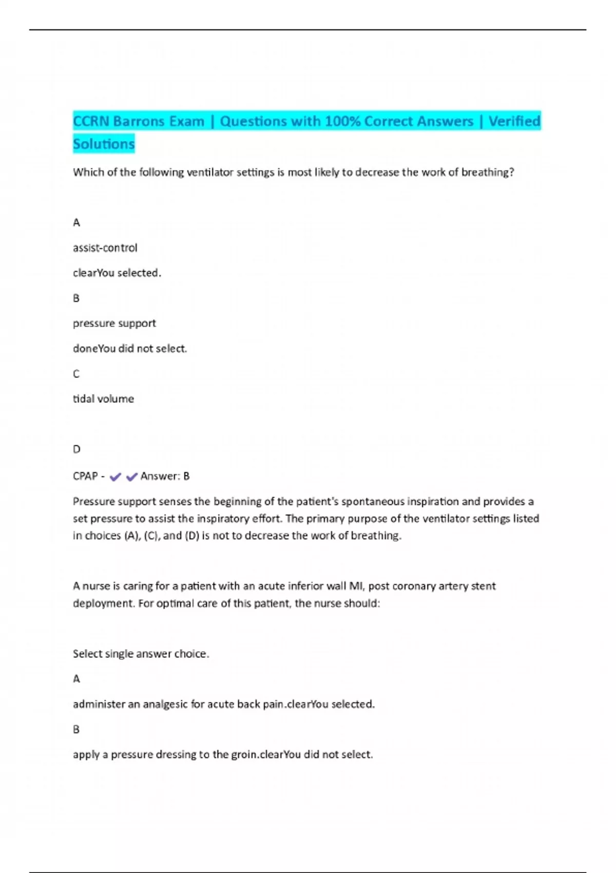 CCRN Barrons Exam | Questions with 100% Correct Answers | Verified Solutions