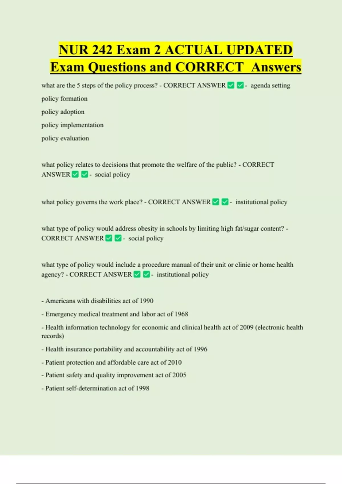 NUR 242 Exam 2 ACTUAL UPDATED Exam Questions and CORRECT Answers what are the 5 steps of the policy process? - CORRECT ANSWER policy formation policy adoption policy implementation policy evaluation - agenda setting what policy relates to decisions that promote the welfare of the public? - CORRECT ANSWER - social polic