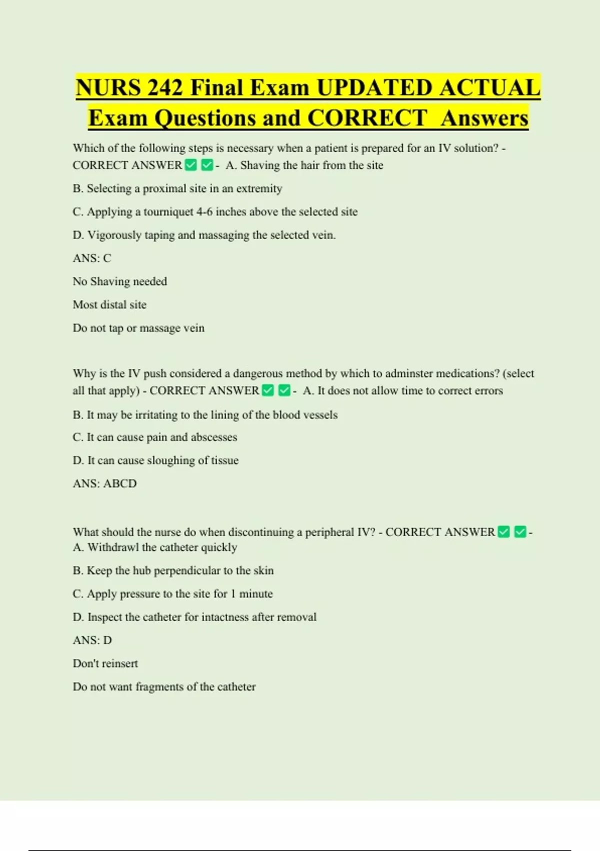 NURS 242 Final Exam UPDATED ACTUAL Exam Questions and CORRECT Answers Which of the following steps is necessary when a patient is prepared for an IV solution? - CORRECT ANSWER - A. Shaving the hair from the site B. Selecting a proximal site in an extremity C. Applying a tourniquet 4-6 inches above the selected site D. Vigorously taping and massaging the selected vein. ANS: C No Shaving needed Most distal site Do not tap or massage vein Why is the IV push considered a dangerous method by which to adminster medications? (select all that apply) - CORRECT ANSWER - A. It does not allow time to correct error