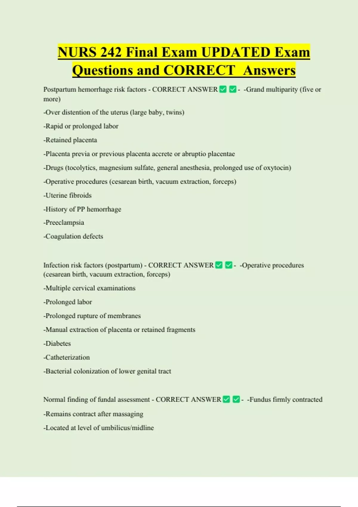 NURS 242 Final Exam UPDATED Exam Questions and CORRECT Answers Postpartum hemorrhage risk factors - CORRECT ANSWER more) -Over distention of the uterus (large baby, twins) -Rapid or prolonged labor -Retained placenta -Placenta previa or previous placenta accrete or abruptio placentae - -Grand multiparity (five or -Drugs (tocolytics, magnesium sulfate, general anesthesia, prolonged use of oxytocin) -Operative procedures (cesarean birth, vacuum extraction, forceps)