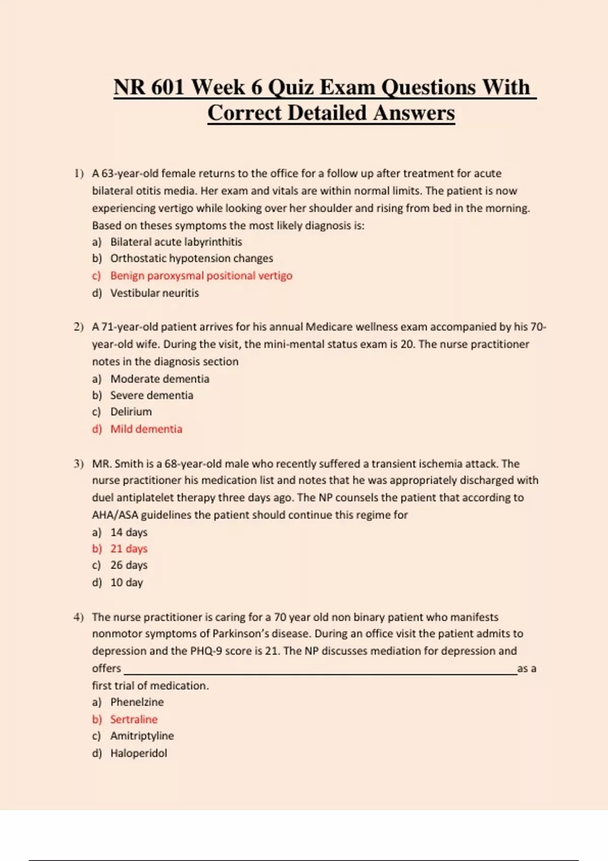 1) A 63-year-old female returns to the office for a follow up after treatment for acute bilateral otitis media. Her exam and vitals are within normal limits. The patient is now experiencing vertigo while looking over her shoulder and rising from bed in the morning. Based on theses symptoms the most likely diagnosis is: a) Bilateral acute labyrinthitis b) Orthostatic hypotension changes c) Benign paroxysmal positional vertigo d) Vestibular neuritis 2) A 71-year-old patient arrives for his annual Medicare wellness exam accompanied by his 70- year-old wife. During the visit, the mini-mental status exam is 20. The nurse practitioner notes in the diagnosis section a) Moderate dementia b) Severe dementia c) Delirium d) Mild dementia 3) MR. Smith is a 68-year-old male who recently suffered a transient ischemia attack. The nurse practitioner his medication list and notes that he was appropriately discharged with duel antiplatelet therapy three days ago. The NP counsels the patient that according to AHA/ASA guidelines the patient should continue this regime for a) 14 days b) 21 days c) 26 days d) 10 day