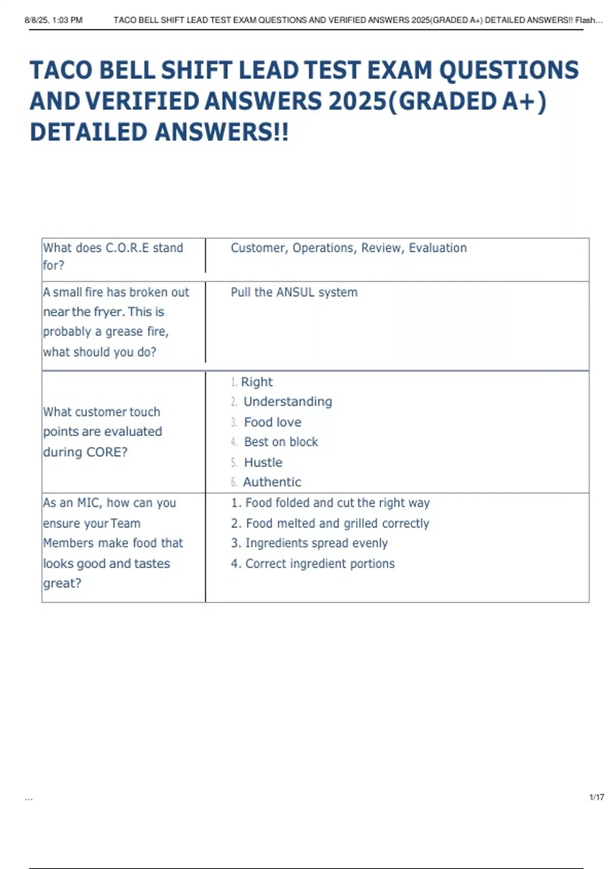 8/8/25, 1:03 PM TACO BELL SHIFT LEAD TEST EXAM QUESTIONS AND VERIFIED ANSWERS 2025(GRADED A+) DETAILED ANSWERS!! Flash…