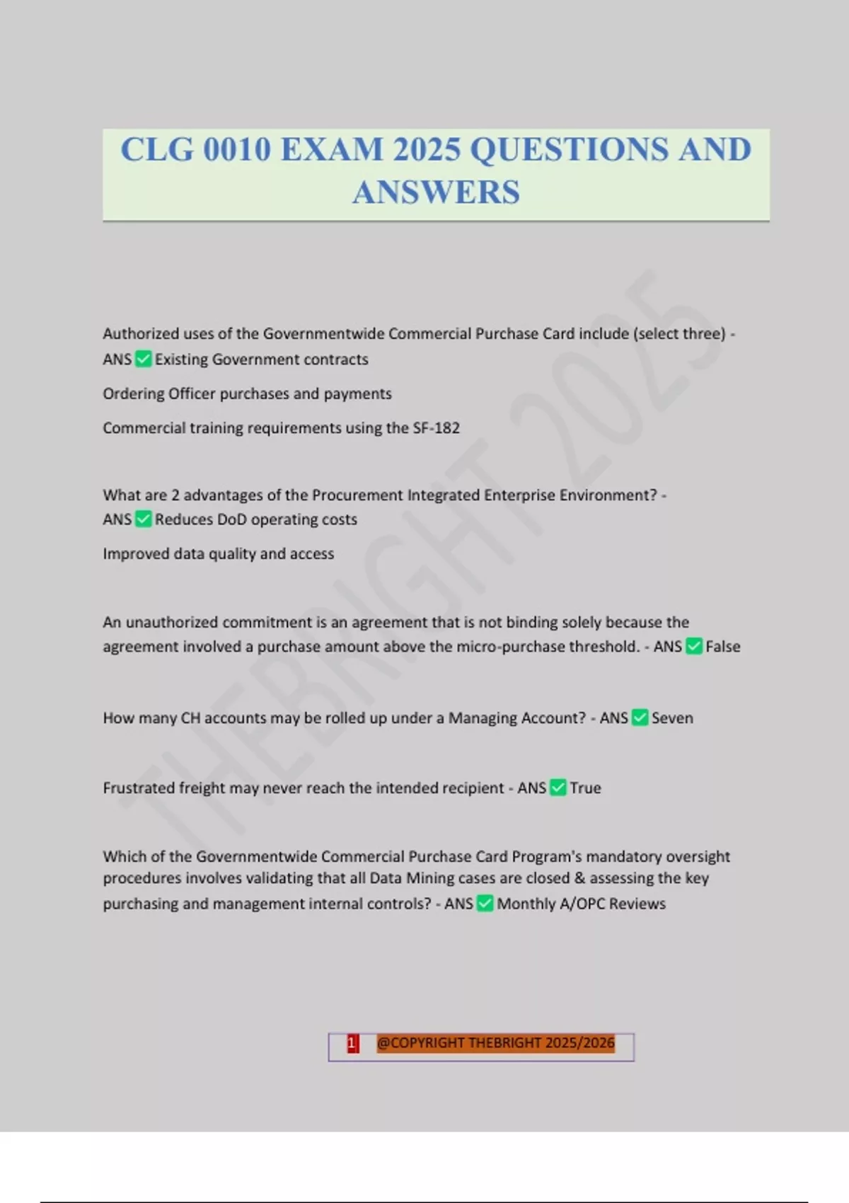 Authorized uses of the Governmentwide Commercial Purchase Card include (select three) - ANS Existing Government contracts Ordering Officer purchases and payments Commercial training requirements using the SF-182 What are 2 advantages of the Procurement Integrated Enterprise Environment? - ANS Reduces DoD operating costs Improved data quality and access An unauthorized commitment is an agreement that is not binding solely because the agreement involved a purchase amount above the micro-purchase threshold. - ANS False How many CH accounts may be rolled up under a Managing Account? - ANS Seven Frustrated freight may never reach the intended recipient - ANS True Which of the Governmentwide Commercial Purchase Card Program's mandatory oversight procedures involves validating that all Data Mining cases are closed & assessing the key purchasing and management internal controls? - ANS Monthly A/OPC Reviews CLG 0010 EXAM 2025 QUESTIONS AND ANSWERS 2 @COPYRIGHT THEBRIGHT 2025/2026 What is the Cardholder Statement of Account? - ANS A document reflecting all purchases and credits that have been posted to the Cardholder's account during the 30 calendar days of the billing cycle. What are the 3 advantages of using the Governmentwide Commercial Purchase Card? - ANS Reduces DoD invoicing costs. Enables the Government to earn refunds. Gives DoD access to information about what its Components buy. 10 USC 2784 requires specific corrective actions for Governmentwide Commercial Purchase Card Program violations. - ANS False Which of the following is defined as "the intentional use of the Government-issued charge card in violation of applicable regulations?" - ANS Abuse The Governmentwide Commercial Purchase Card _____ used as the method of payment for commercial training requests using the SF-182, valued at or below $25,000, in lieu of an employee reimburse