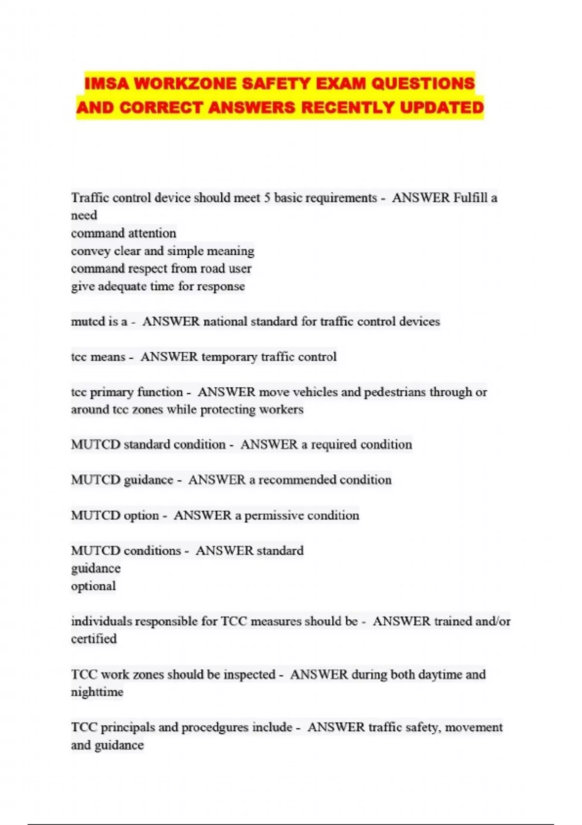 IMSA WORKZONE SAFETY EXAM QUESTIONS AND CORRECT ANSWERS RECENTLY UPDATED....