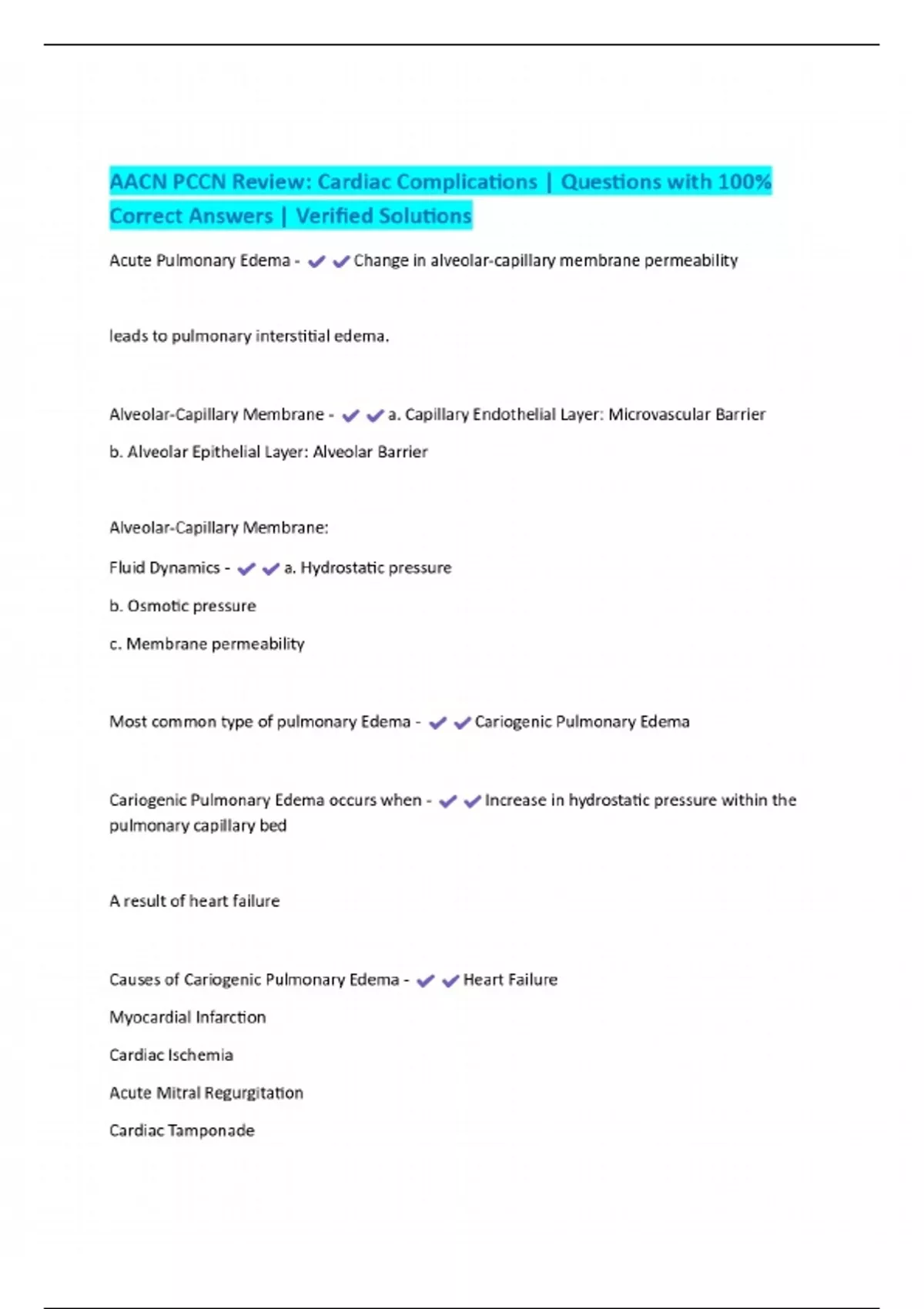 AACN PCCN Review: Cardiac Complications | Questions with 100% Correct Answers | Verified Solutions