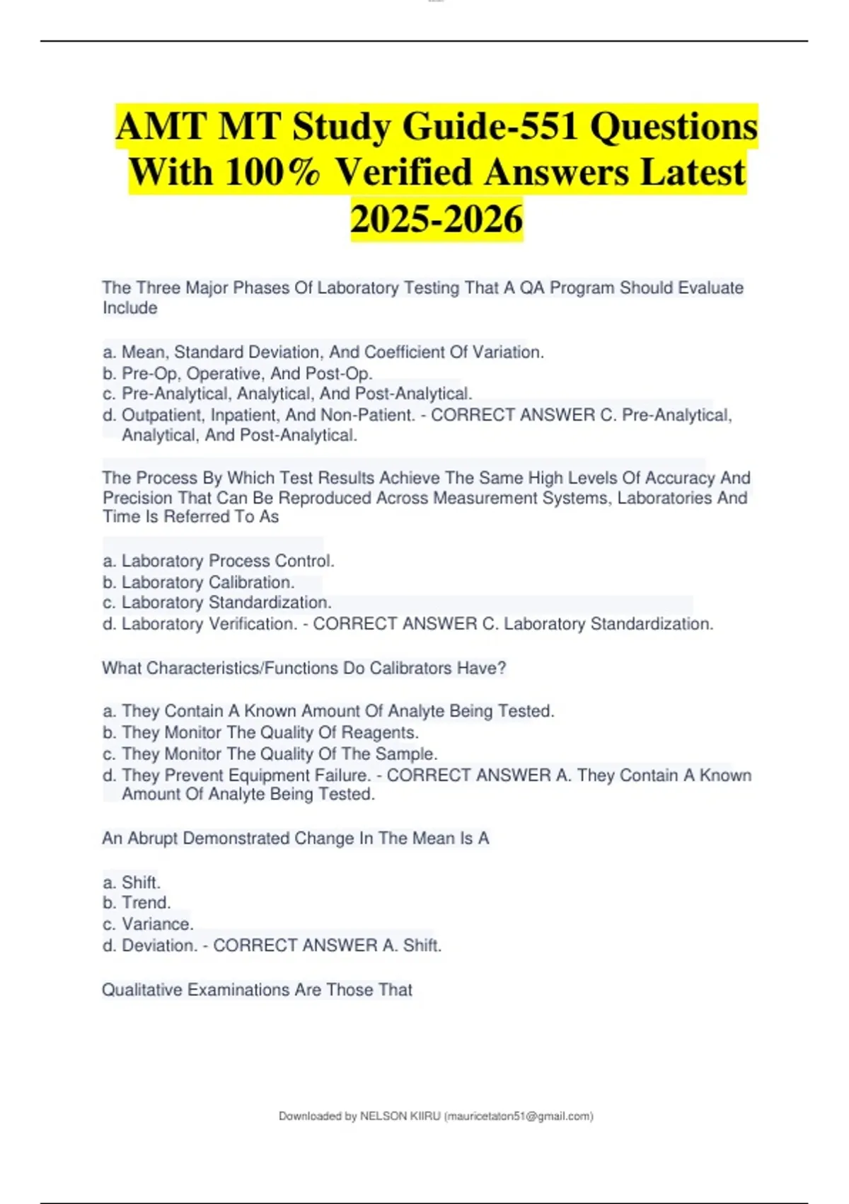 AMT MT Study Guide-551 Questions With 100% Verified Answers Latest The Three Major Phases Of Laboratory Testing That A QA Program Should Evaluate Include a. Mean, Standard Deviation, And Coefficient Of Variation. b. Pre-Op, Operative, And Post-Op. c. Pre-Analytical, Analytical, And Post-Analytical. d. Outpatient, Inpatient, And Non-Patient. - CORRECT ANSWER C. Pre-Analytical, Analytical, And Post-Analytical. What Characteristics/Functions Do Calibrators Have? a. They Contain A Known Amount Of Analyte Being Tested. b. They Monitor The Quality Of Reagents. c. They Monitor The Quality Of The Sample. d. They Prevent Equipment Failure. - CORRECT ANSWER A. They Contain A Known Amount Of Analyte Being Tested. An Abrupt Demonstrated Change In The Mean Is A An Abrupt Demonstrated Change In The Mean Is A a. Shift. b. Trend. c. Variance. d. Deviation. - CORRECT ANSWER A. Shift. Qualitative Examinations Are Those That